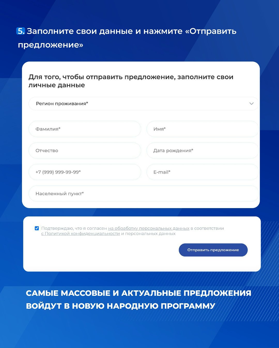 Каждый желающий может направить свои идеи и инициативы — все поступившие предложения будут рассмотрены экспертами при подготовке нового предвыборного документа.