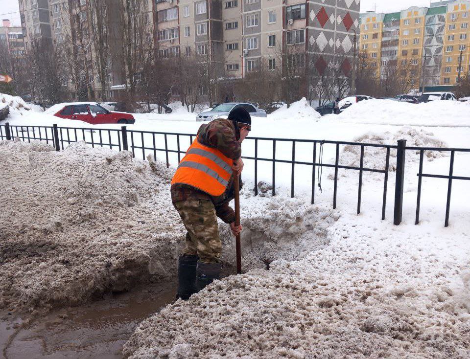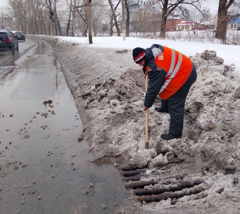 Специалисты вручную расчищают решетки ливневой канализации, чтобы растаявший снег смог беспрепятственно стекать в водоотвод.