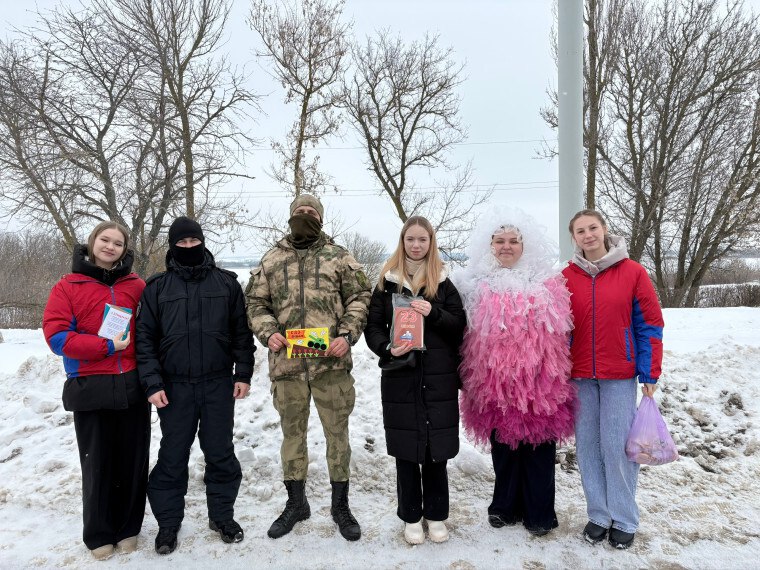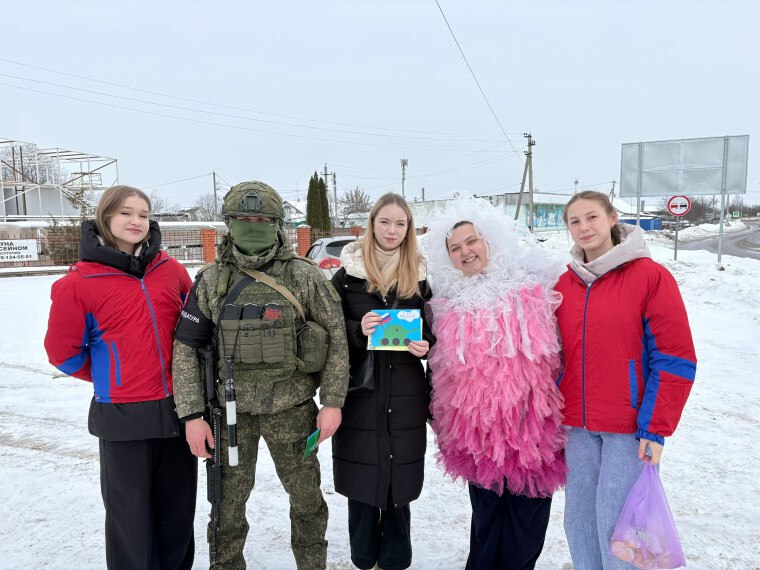 Кроме того, волонтёры дежурили на постах при въезде в город, где также поздравляли защитников Отечества.