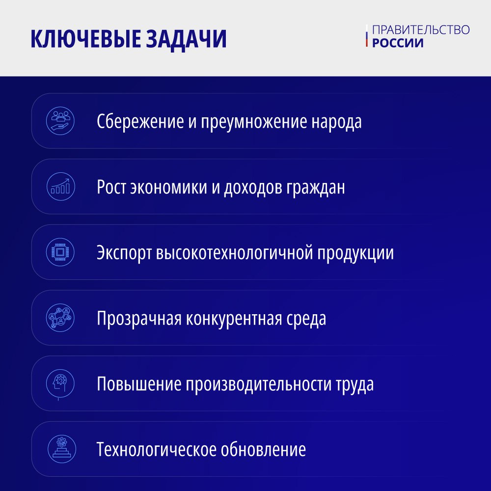 Кроме того, Правительство обеспечило старт новым национальным проектам. Большинство из них ориентированы на технологическое лидерство России.