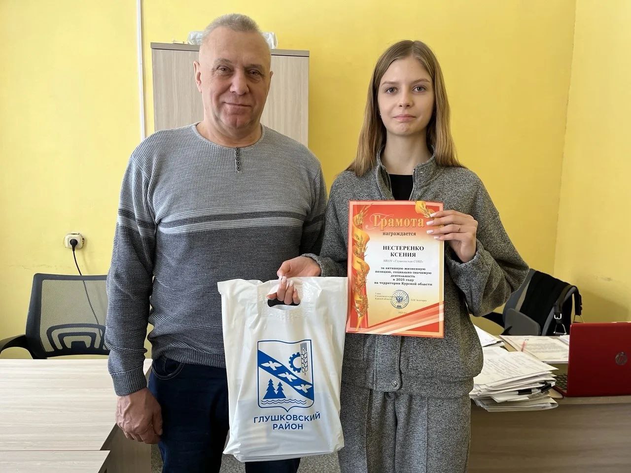 Еще вручил Ксении Грамоту Главы района за активную жизненную позицию и социально-значимую деятельность, а также памятный подарок.