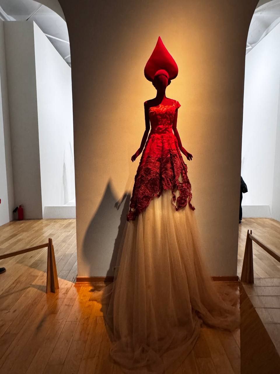 Рядом - знаковое платье «Божественная Майя» из собрания Эрмитажа, посвященное Майе Плисецкой. Образ абсолютной свободы и полета, застывший в черном шелке.