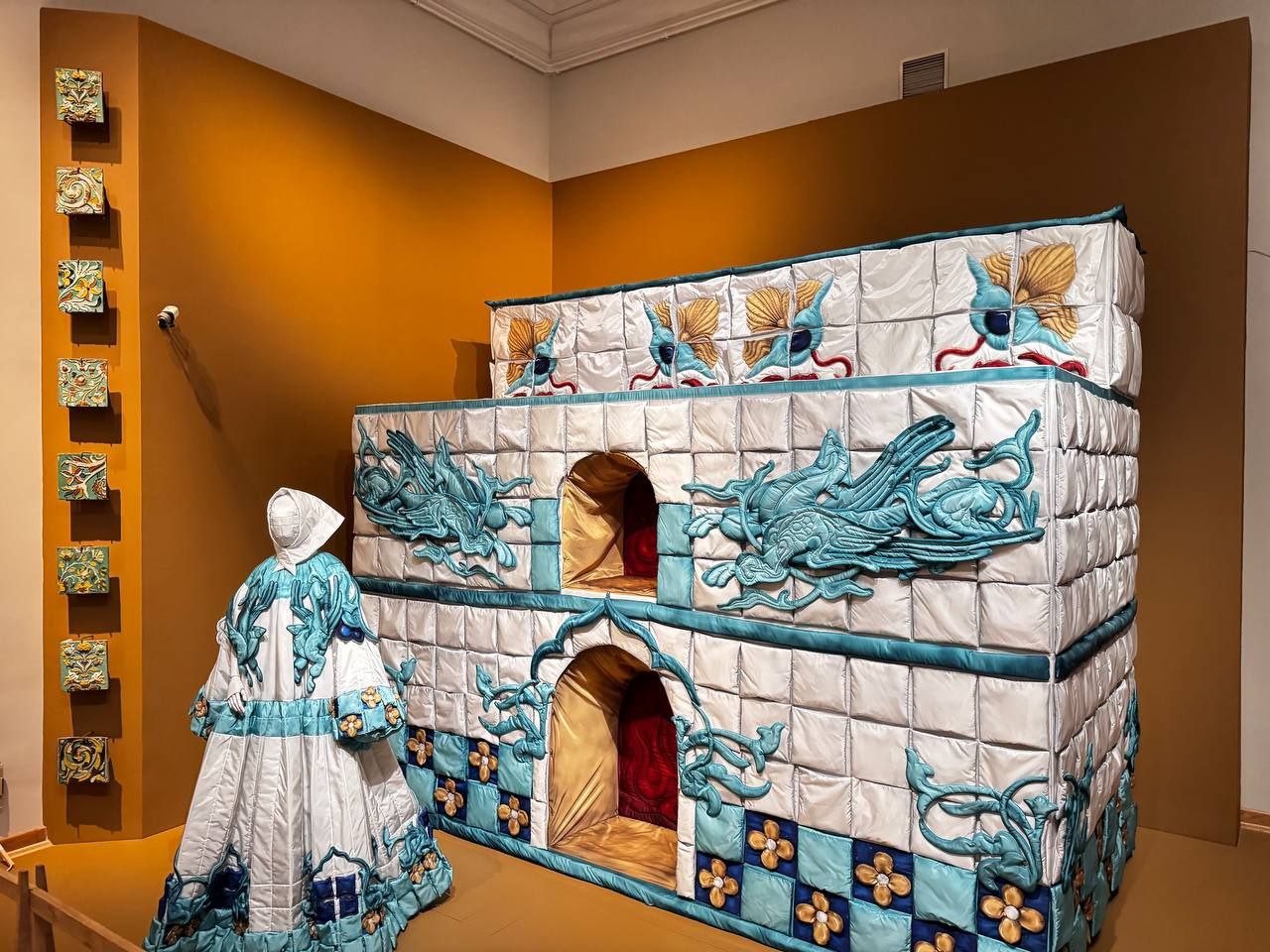 Кружево, кристаллы и перья, которые соседствуют с коваными сундуками и изразцами из коллекции музея.