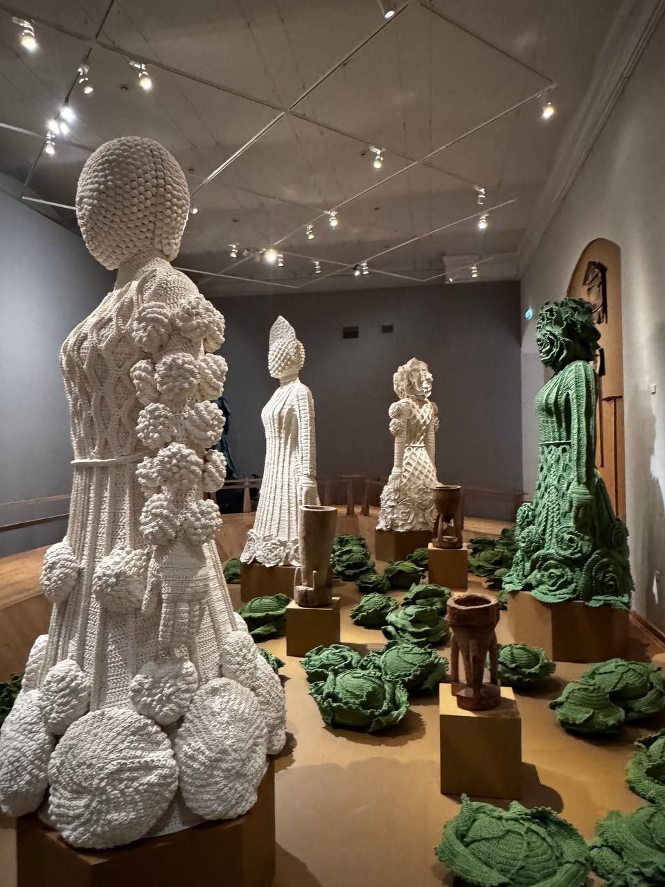 Вязаная крючком капуста - огромная, фактурная, живая. Она лежит в окружении настоящих резных наличников и старинных зеркал. Это символ рождения и связи с корнями, но выполненный так трепетно и современно.