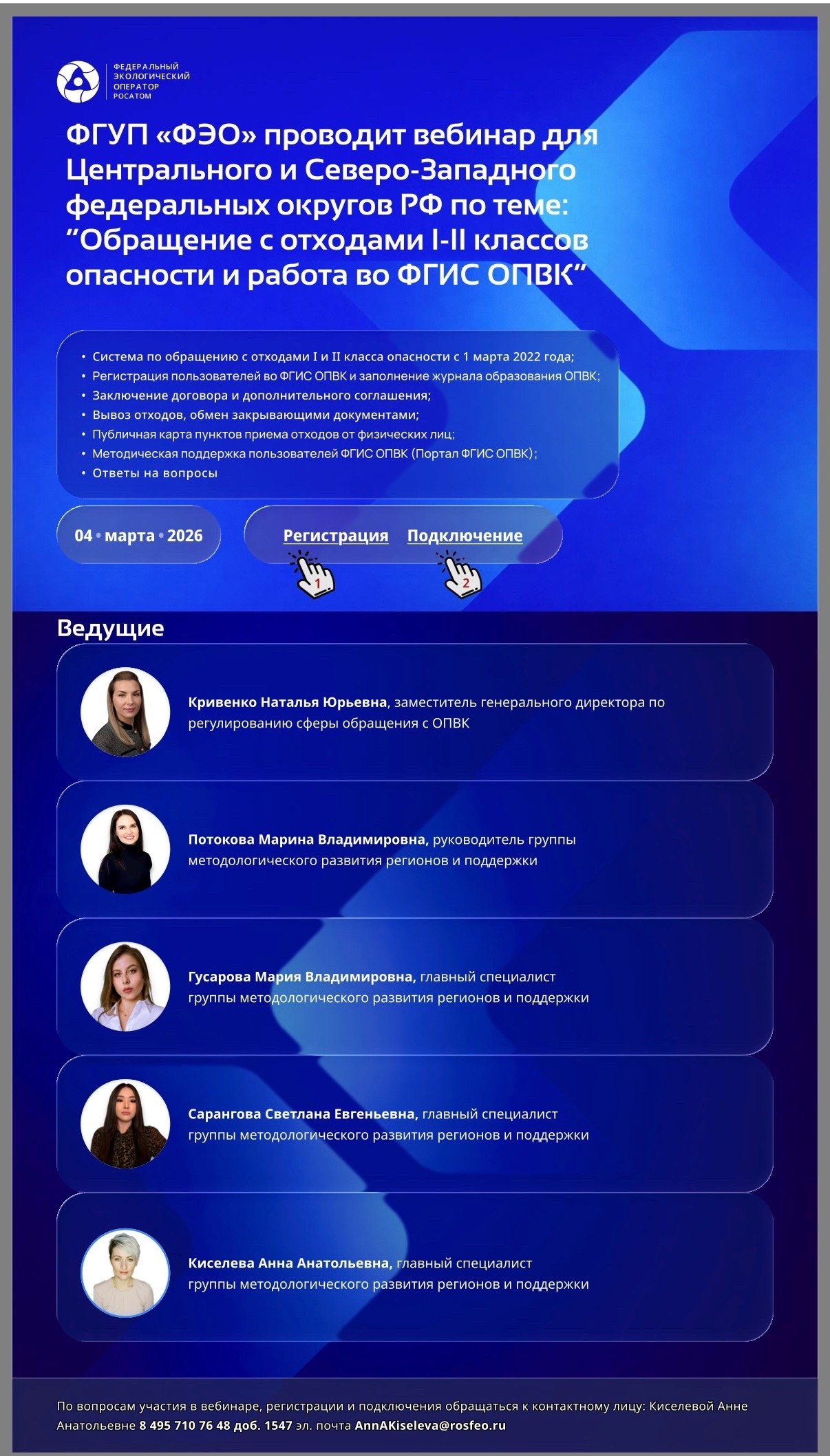 Министерство экономического развития в рамках методологической поддержки пользователей в части осуществления деятельности по обращению с отходами I и II класса опасности ФГУП «ФЭО» проведет 4 марта 2026 года с 9:30 до 11:30 (по московскому времени) обучающий вебинар по работе в федеральной государственной информационной системе учета и контроля за обращением с отходами I и II классов опасности.