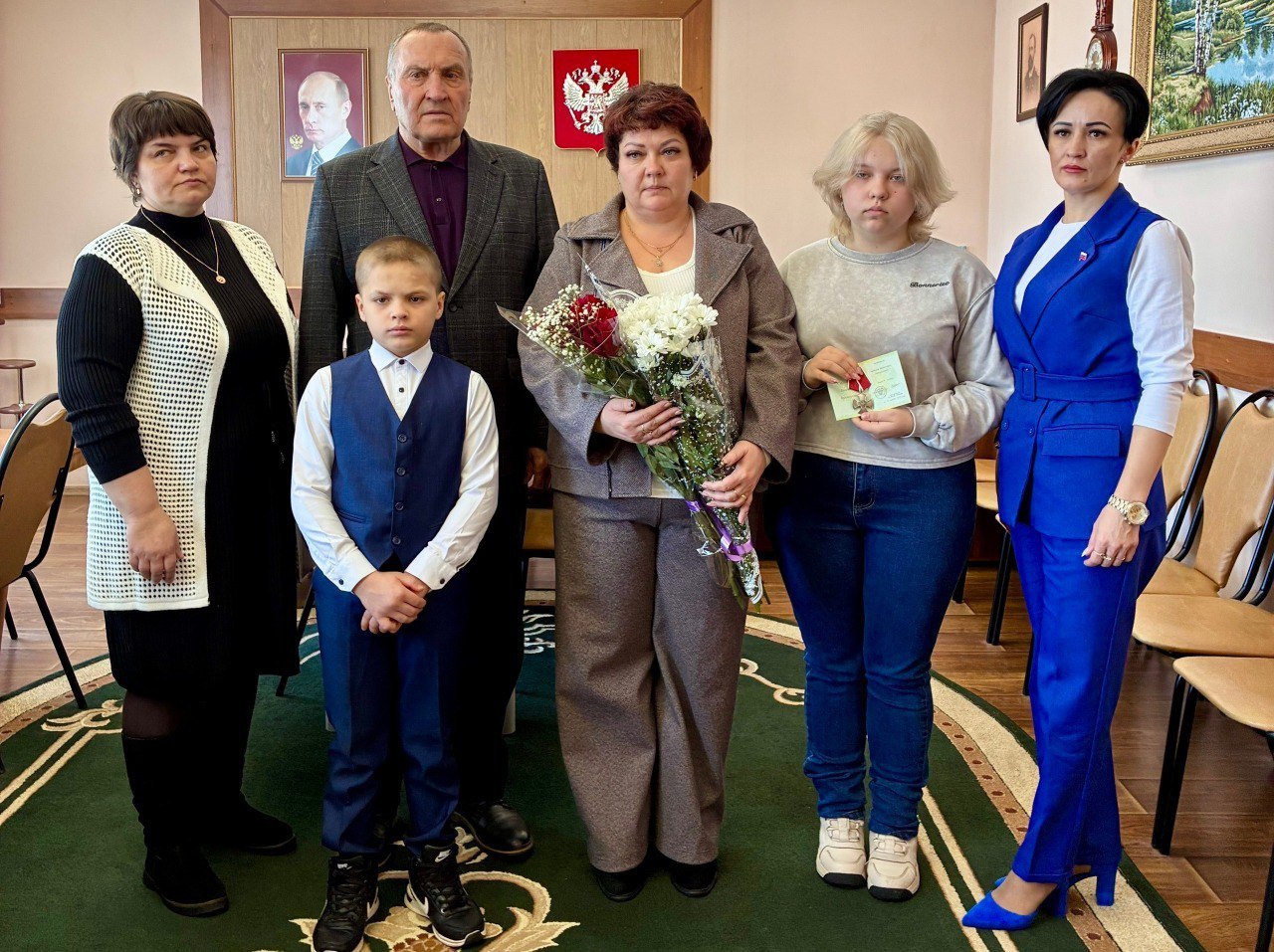 Глава района Михаил Игнатов передал государственную награду семье военнослужащего – жене Виктории Валерьевне и детям Елизавете и Дмитрию.