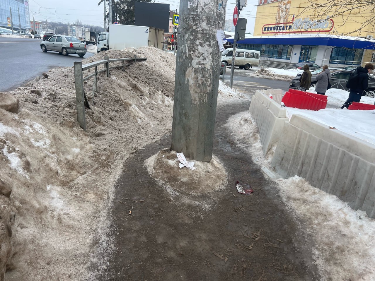 Ситуация усугубилась после снегопадов. Людям приходится протискиваться в узком пространстве между сугробами, оставшимися после расчистки дороги, ограждением и столбом, стоящим посреди узкого прохода. А из-за того, что тротуар в этом месте чистят плохо, неровная тропинка еще и очень скользкая.
