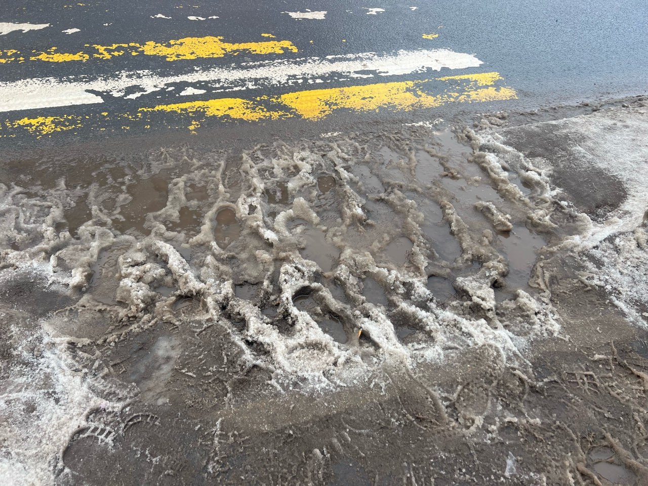 «Выходить на дорогу приходится в снежную кашу или лужи. А для ожидания зеленого сигнала остается крошечный пятачок у самой проезжей части. Проезжающие машины окатывают пешеходов грязью, а отступить некуда — позади ограждение», — рассказывают горожане.