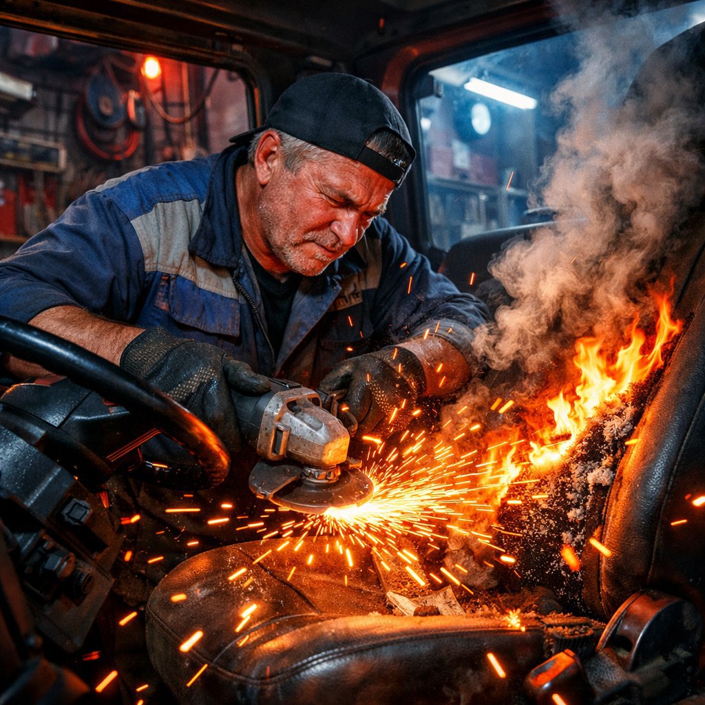 55-летний автослесарь работал «болгаркой» в кузове грузового автомобиля. Искры от инструмента попали на сидения.