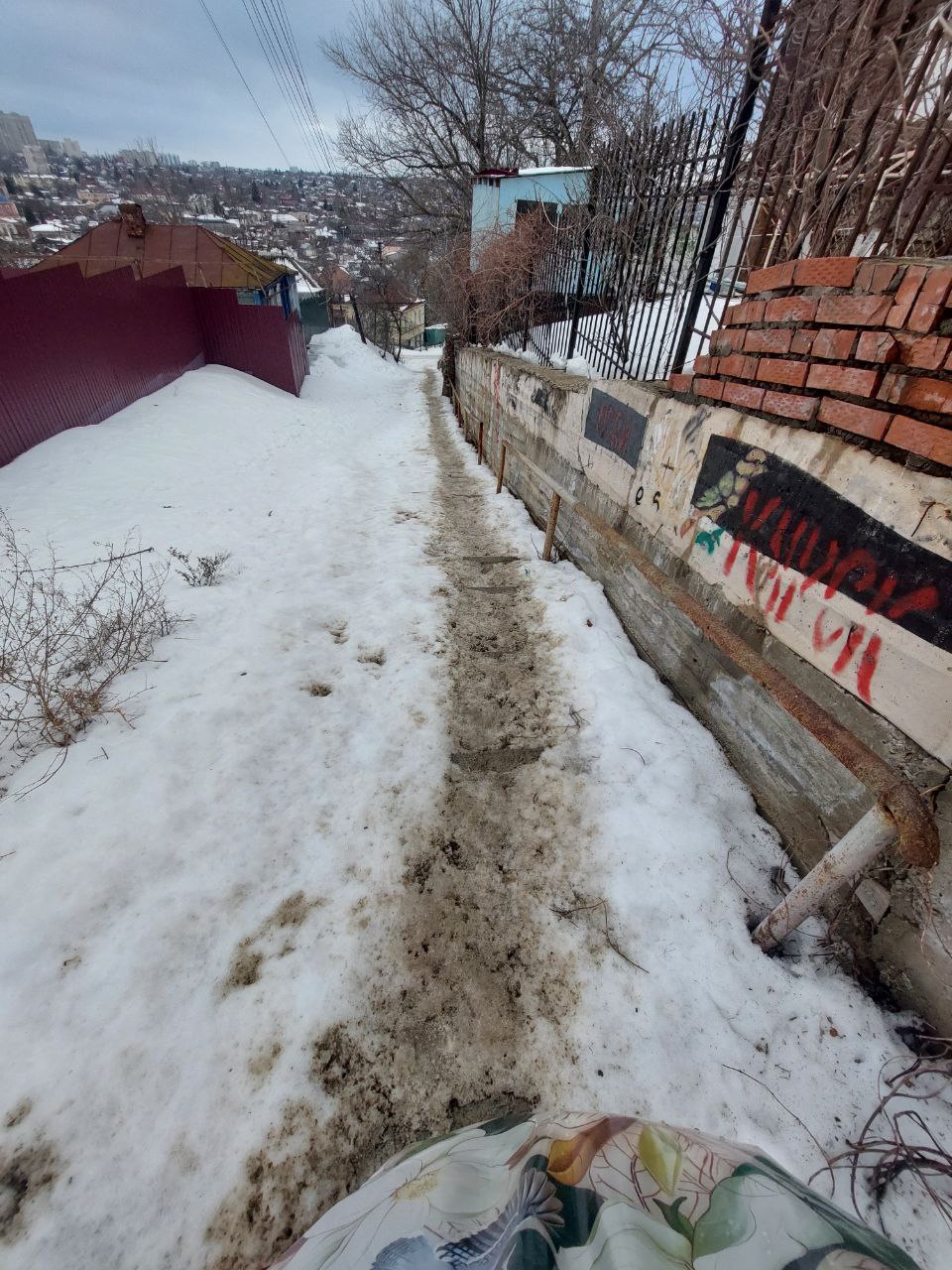 Нам пишут: "Спуск по улице Почтовая с улицы Семеновской. С момента обильных снегопадов не чистили ни разу. Лестницу под слоем снега даже не видно".