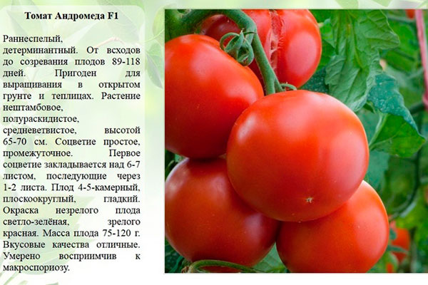 Кусты Андромеды F1 имеют низкорослый, полураскидистый вид, достигая высоты около 70 см. Листья небольшие и серо-зелёные. Плоды имеют классическую форму и цвет, со средней массой от 70 до 120 г.