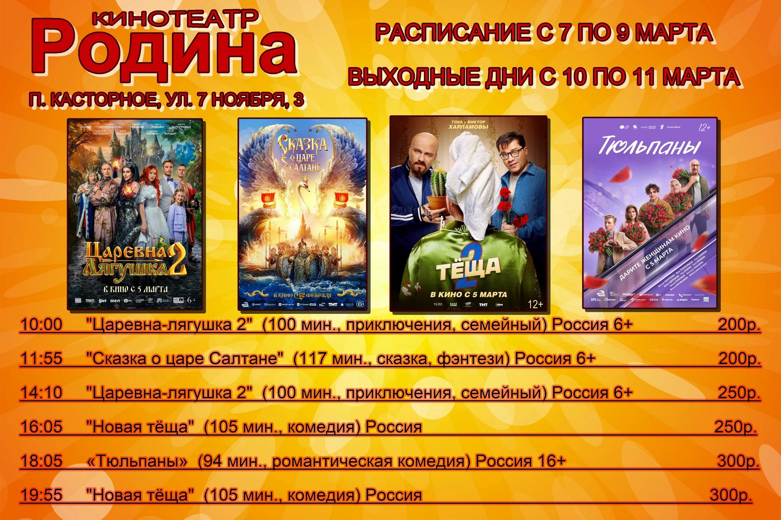 Рады представить вам расписание сеансов в кинотеатре "Родина" на период с 5 по 9 марта.
