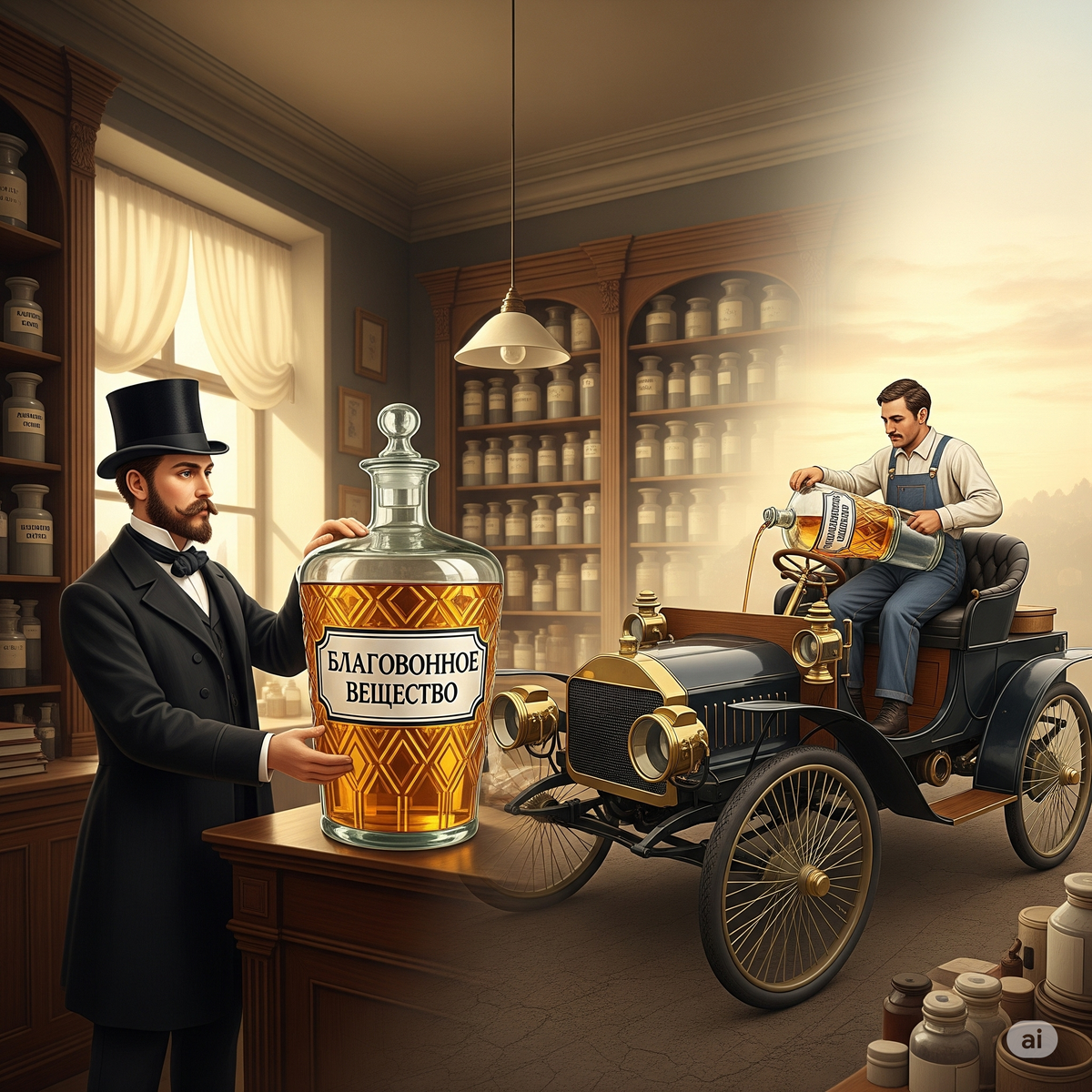 Однако на самом деле, это "благовонное вещество" не предназначалось для стирки. На улице стояло ярко раскрашенное четырехколесное «чудовище», подобное электрокартам, только с необычным ящиком на боку. Этот брутальный клиент переливал жидкость в специальную емкость, громко заявляя аптекарю, что начнет делать покупки трижды в неделю, так как именно у него в аптеке оказался лучший бензин в городе.