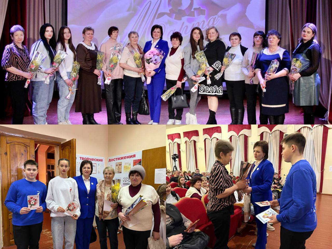 На праздничный концерт, посвящённый 8 Марта, были приглашены особые гости — мамы, жены и сёстры участников СВО, отдавших жизни за Родину. Социальный координатор Татьяна Овсянникова совместно с активистами «Движения Первых» тепло поздравили женщин с праздником весны, вручили цветы и открытки.Важно было не просто поздравить, а окружить этих женщин теплом, заботой и той искренней, неформальной поддержкой, которая так необходима. Татьяна Валериевна адресовала каждой из присутствующих женщин личные слова: