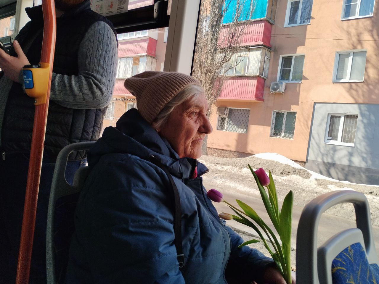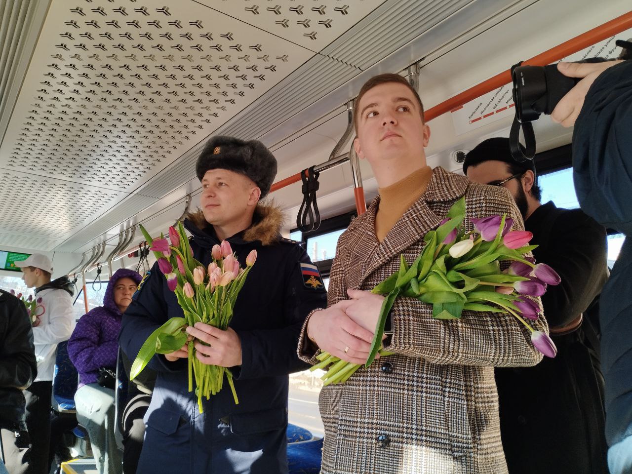 Вместе с волонтёрами в транспорте курянок поздравлял председатель комитета молодежной политики Курской области Максим Щедрин и участник региональной программы «Курск. Герои!» Андрей Милютин. Для женщин звучали добрые пожелания, любимые песни, а приятным дополнением стали подарки и цветы.