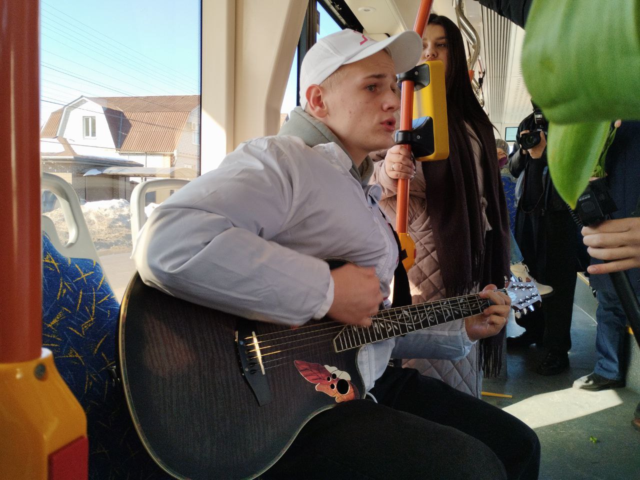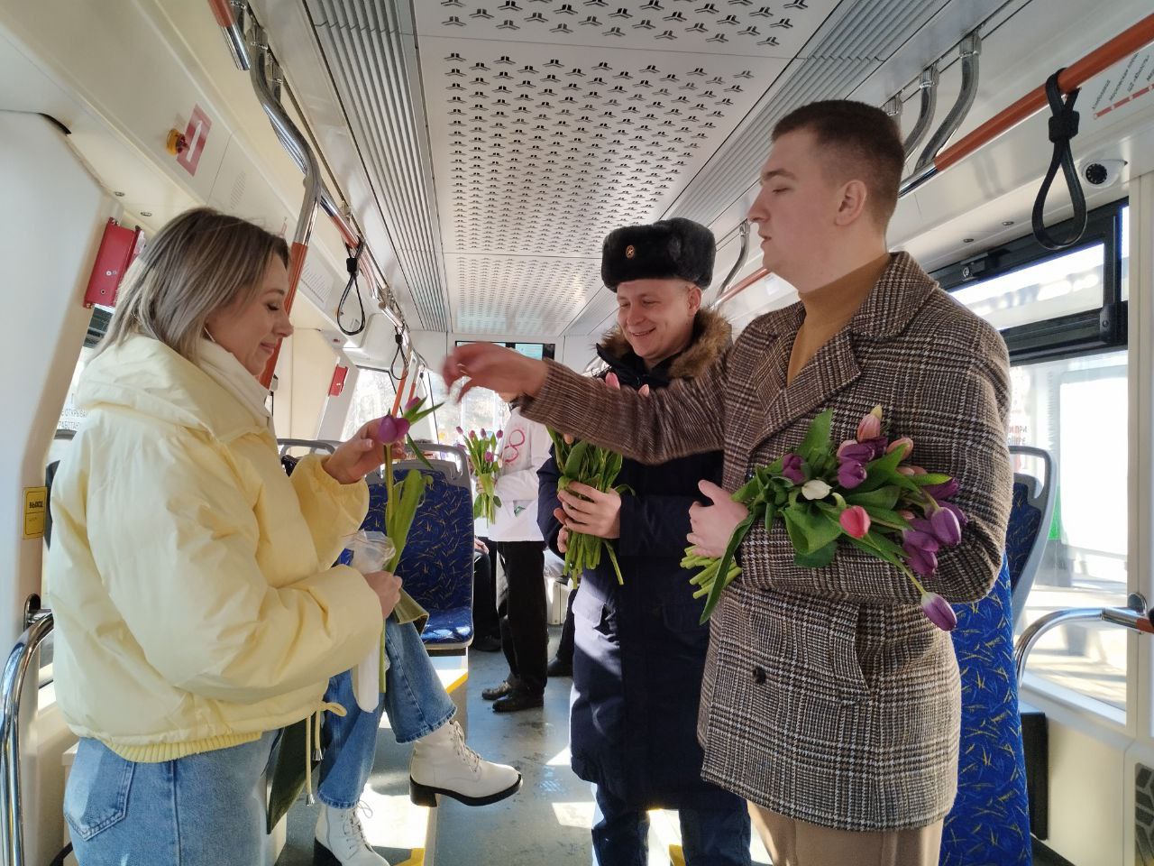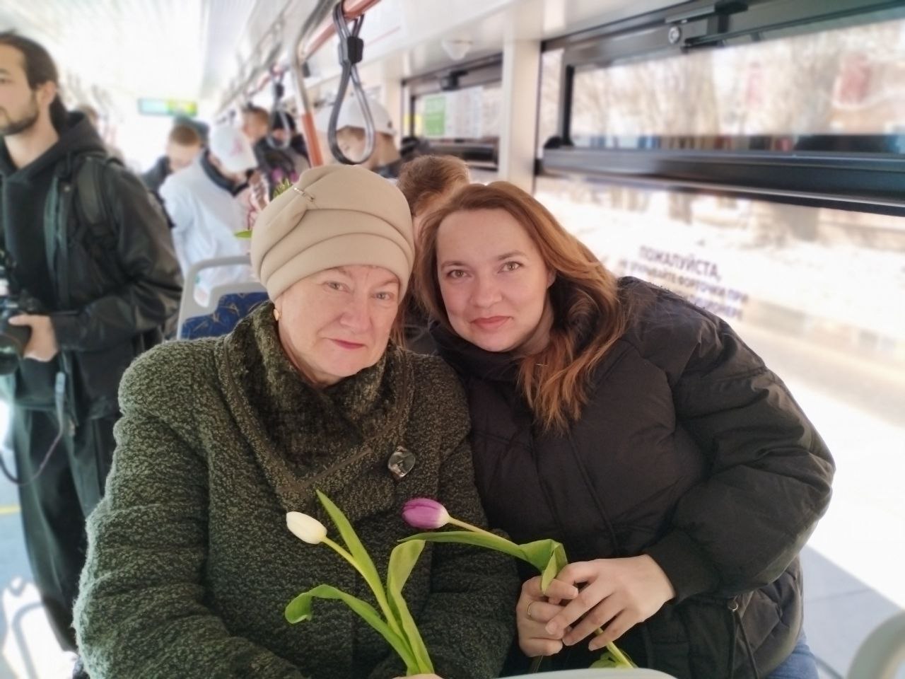 Необычное поздравление ждало пассажирок трамвая №1. Начиная от остановки «Хлебозавод», вагон превратился в настоящую творческую площадку.