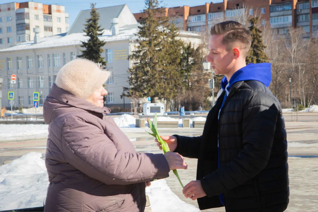 Сегодня вместе с ребятами из «Молодой Гвардии» партии Единой России провели акцию, в рамках которой раздавали тюльпаны курянкам в центре города.