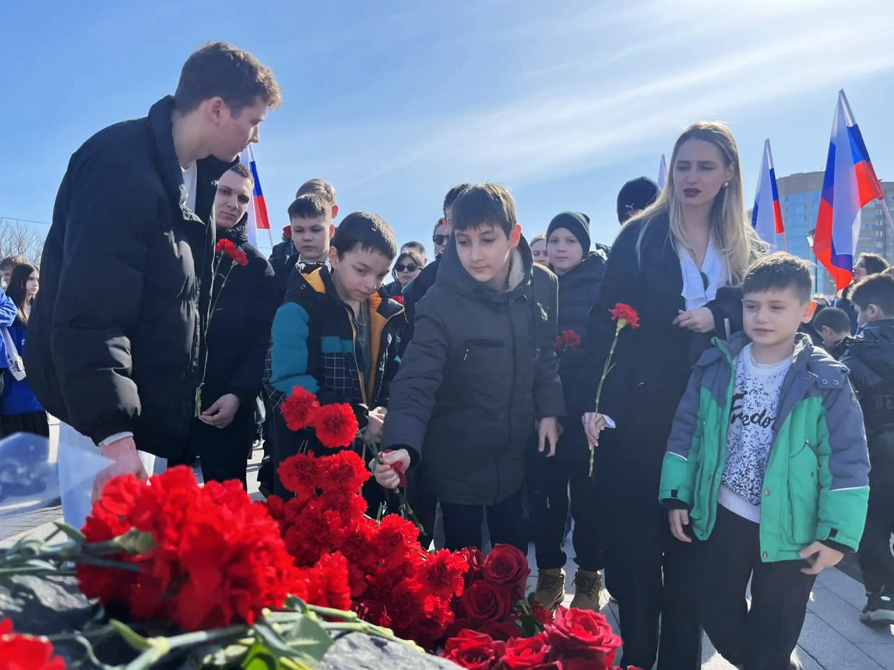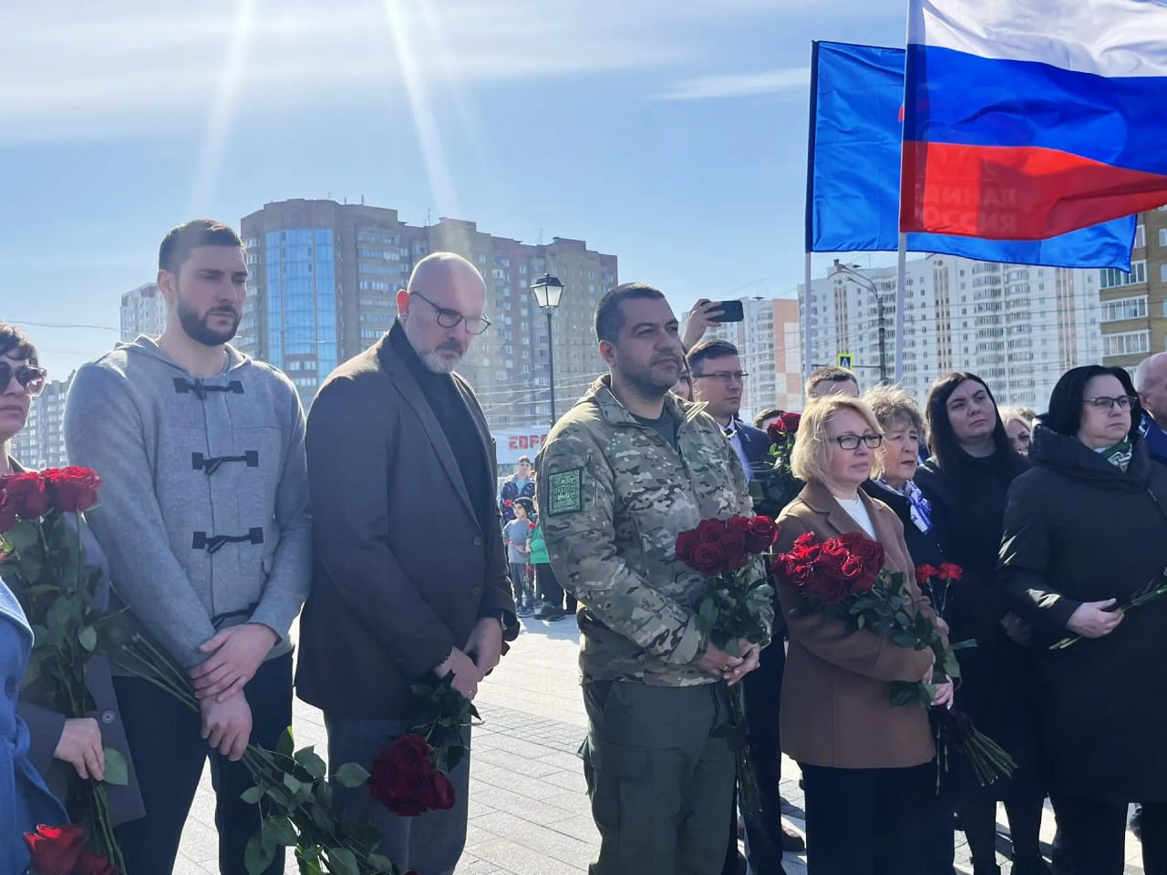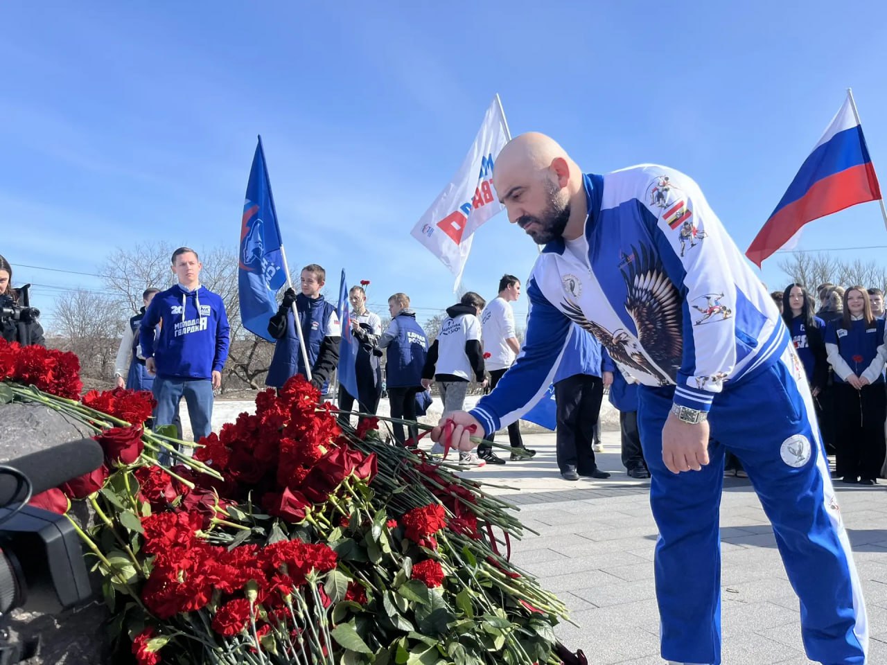 В возложении приняли участие российские волейболисты, олимпийские чемпионы Сергей Тетюхин и Дмитрий Ильиных и юные волейболисты из приграничных районов.