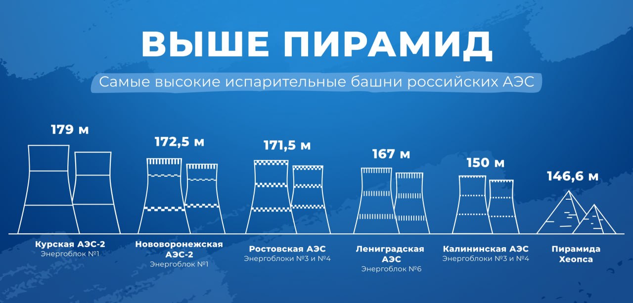 В пресс-службе Курской АЭС-2, видимо, решили, что сухие технические отчёты — это скучно, и выдали сравнение, которое рискует завируситься. Оказывается, новые градирни станции высотой 179 метров обогнали не только все российские аналоги, но и мировые достопримечательности: пирамиду Хеопса (146 м) и лондонский Биг-Бен (96 м).