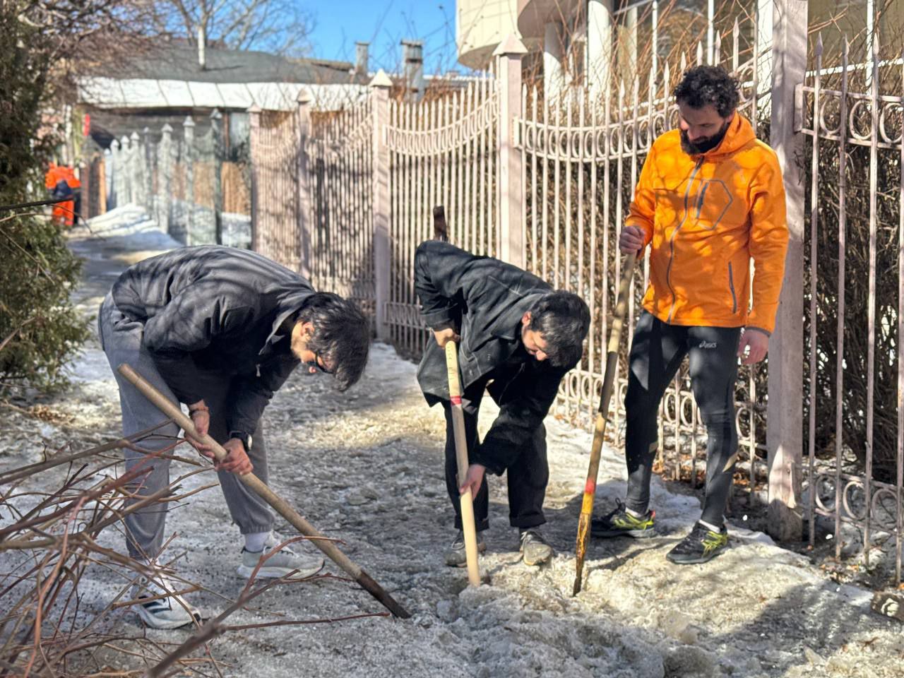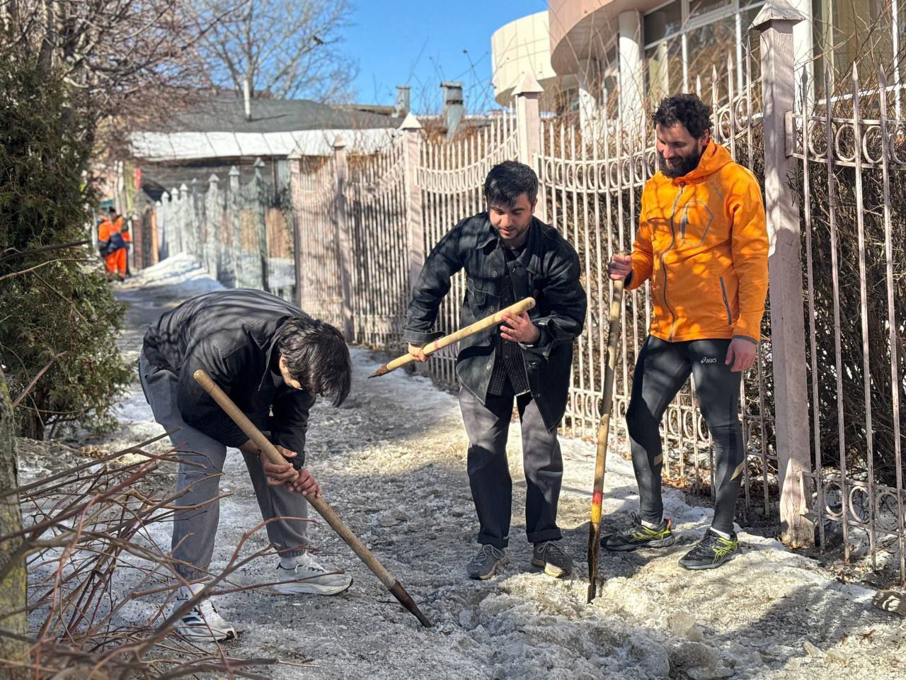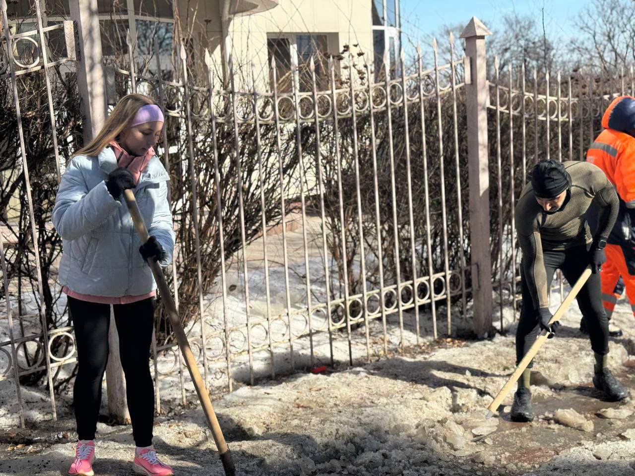 В этот солнечный день куряне взялись за лом и лопаты, чтобы убрать лёд и сделать передвижение жителей комфортным и безопасным.