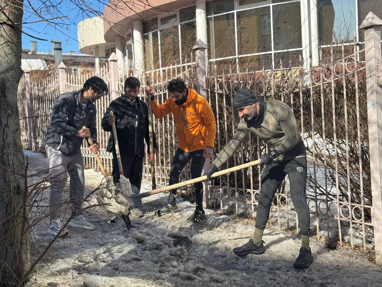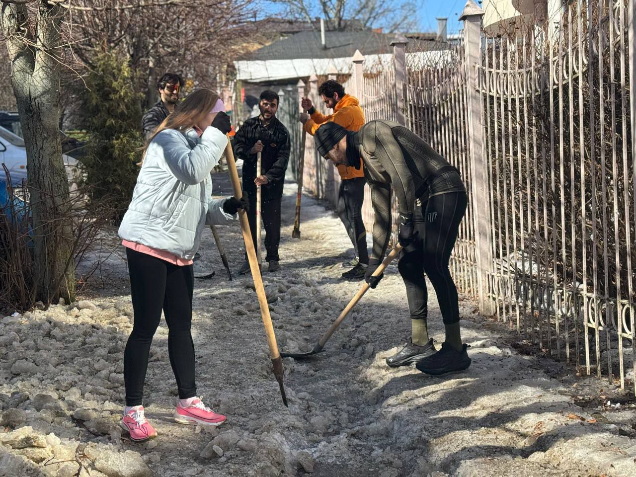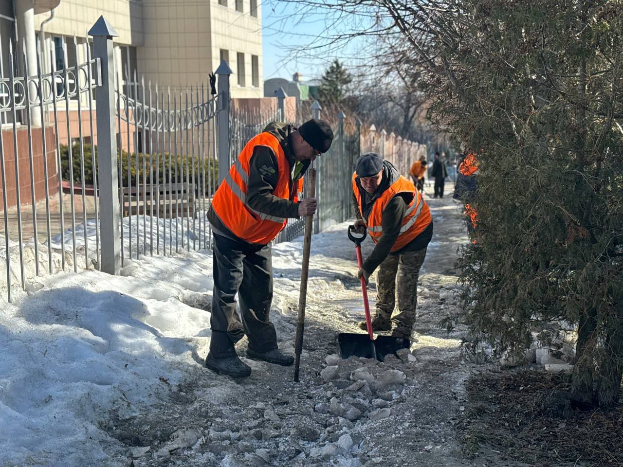 В этот солнечный день куряне взялись за лом и лопаты, чтобы убрать лёд и сделать передвижение жителей комфортным и безопасным.