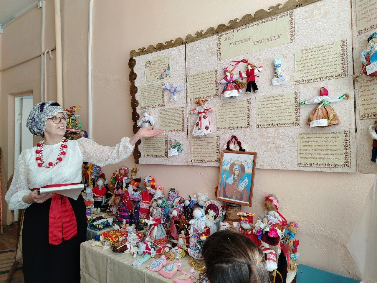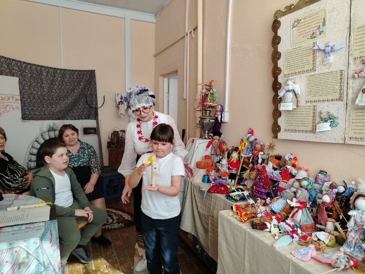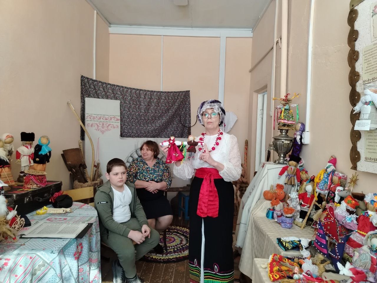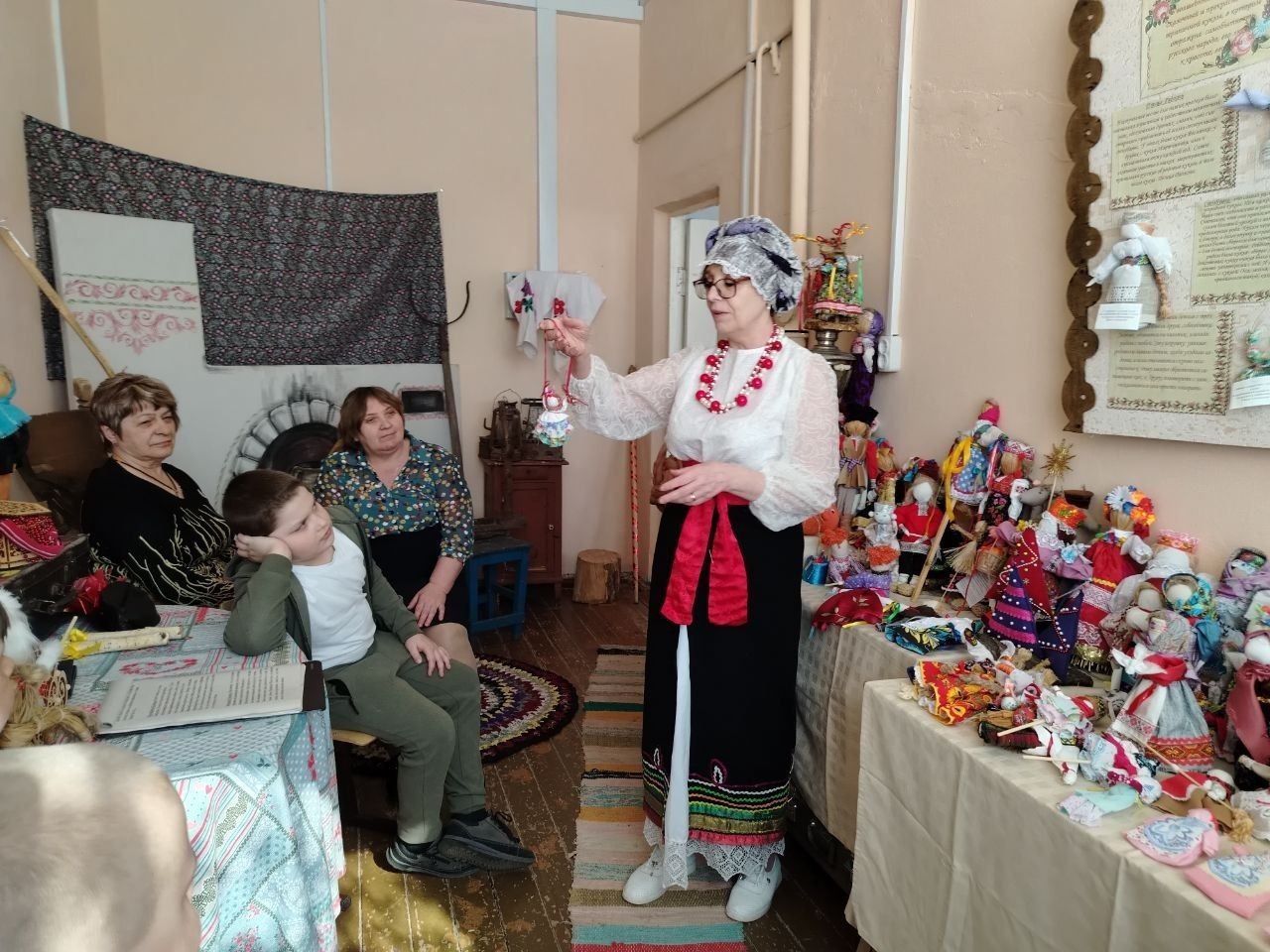 Руководитель музея, Ирина Алексеевна Бобровникова, рассказала о разнообразии тряпичных кукол. Ребята узнали, что эти куклы были неотъемлемой частью крестьянского быта: не только игрушками, но и верными спутниками человека на протяжении всей жизни. Они участвовали в календарных обрядах, сопровождали в горе и радости – на свадьбах и при рождении детей.