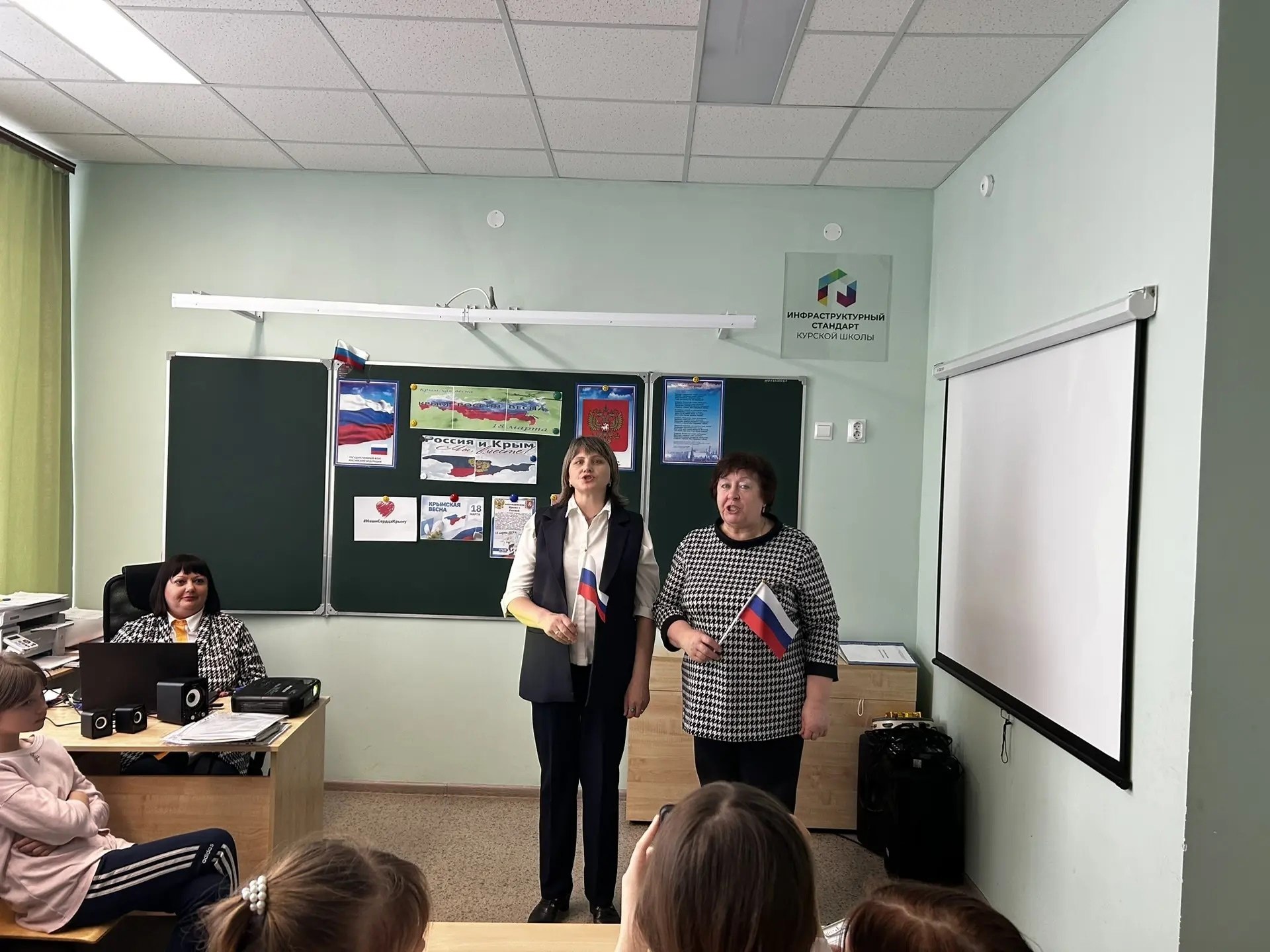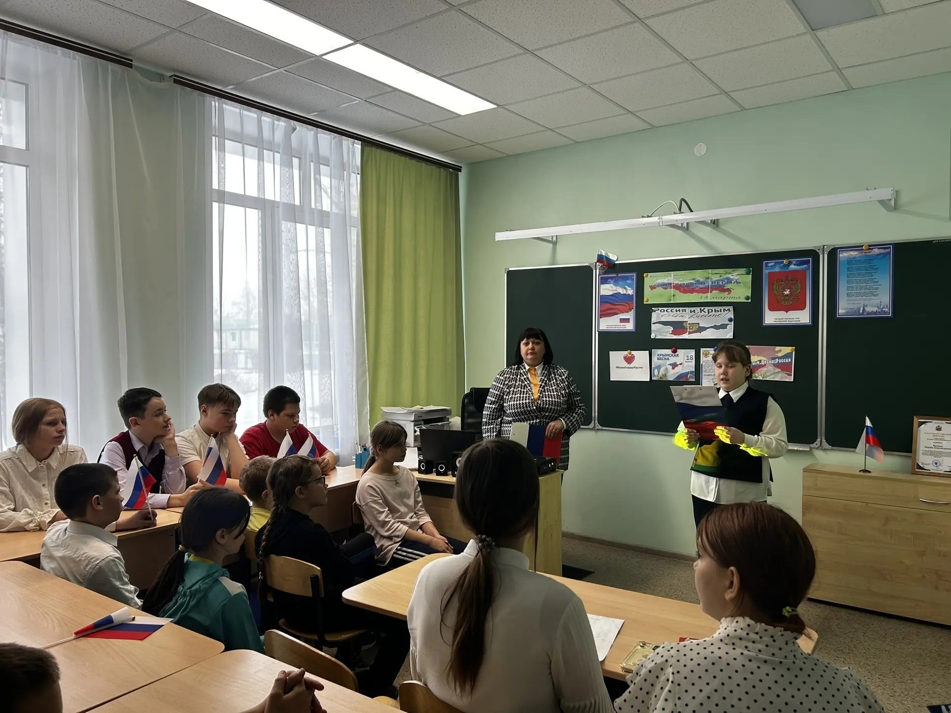 В преддверии празднования дня Воссоединения Крыма с Россией, в школе советником директора по воспитанию организован познавательный час «Крым,Россия, Весна» К проведению мероприятия присоединились социальные партнёры школы - сельский библиотекарь Красникова М. В. и работник Дома Культуры Пашкова Л. Ф.