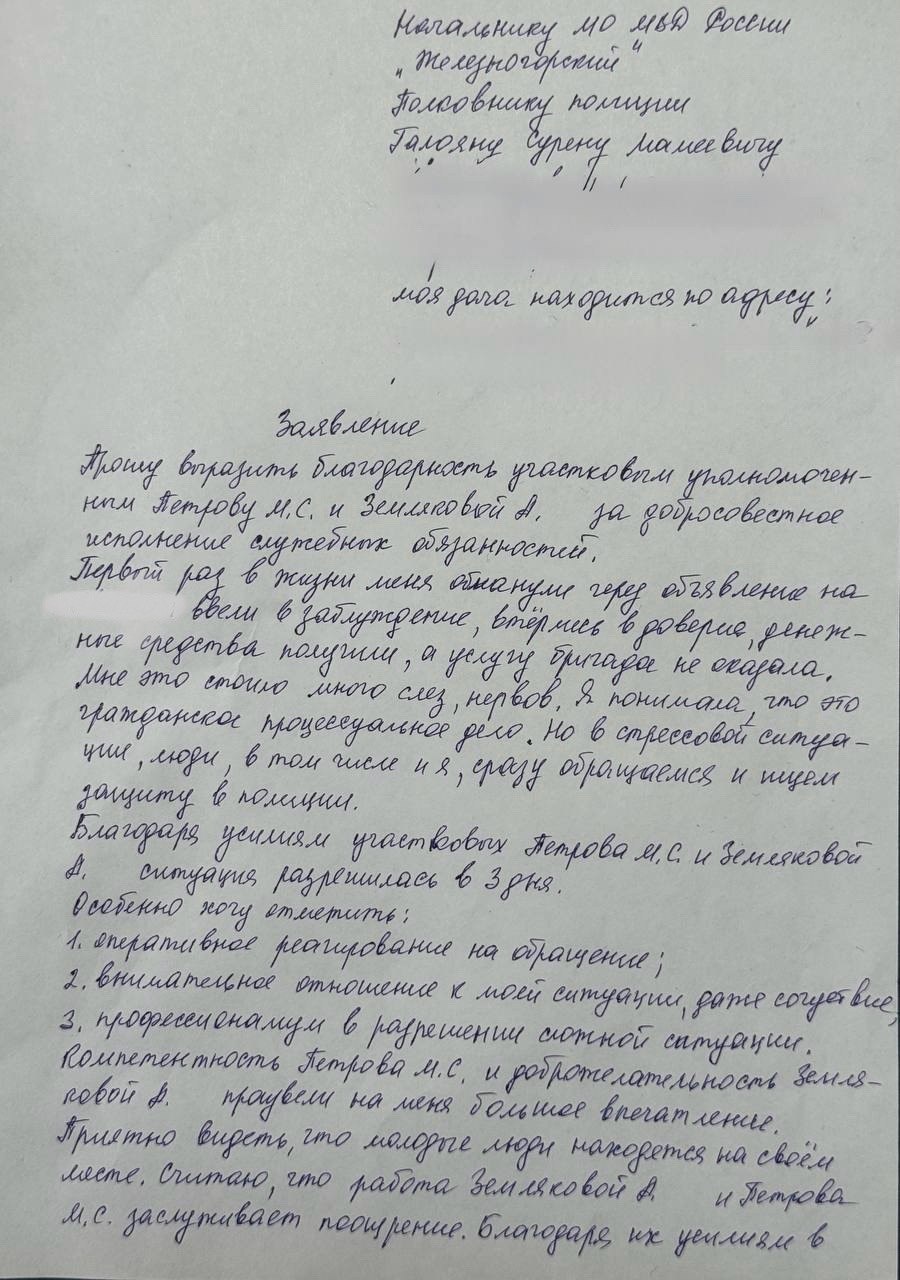 В Железногорске местные участковые помогли жительнице вернуть средства за некачественную работу. В благодарность женщина написала письмо на имя начальника городского отдела МВД.