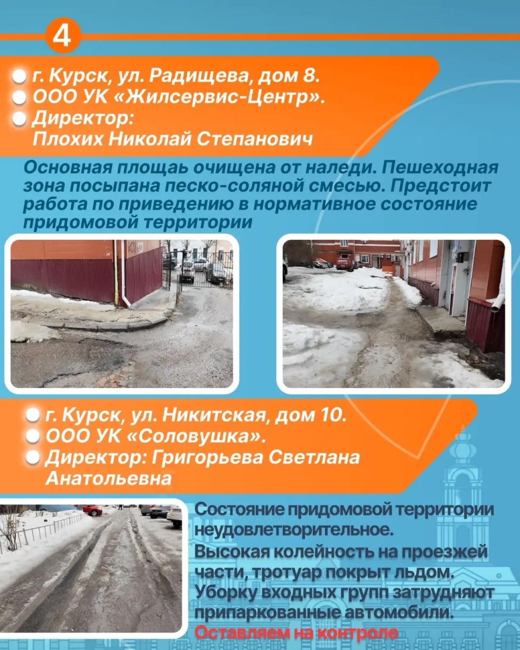 Все выявленные недостатки зафиксированы, управляющим компаниям выдали предписания с жёсткими сроками. Контроль обещают не снимать, пока тротуары и подъезды не станут безопасными.