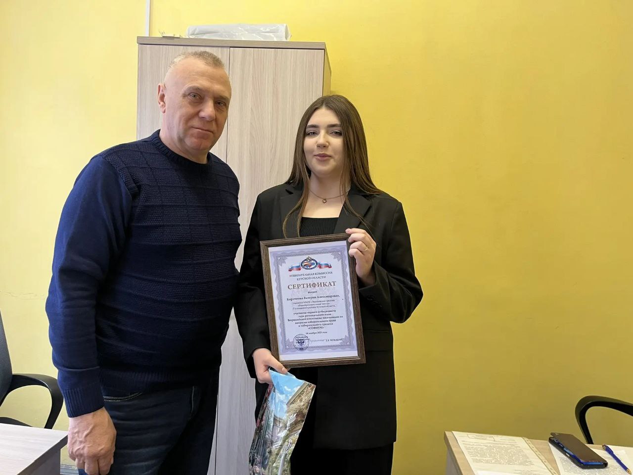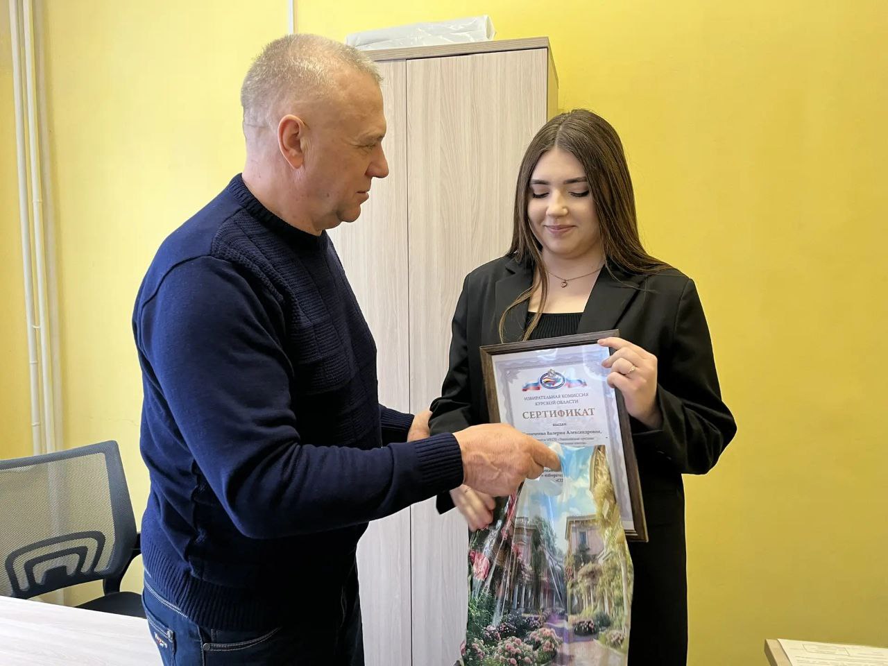 Вручил ей сертификат участника Олимпиады от Избирательной Комиссии Курской области.