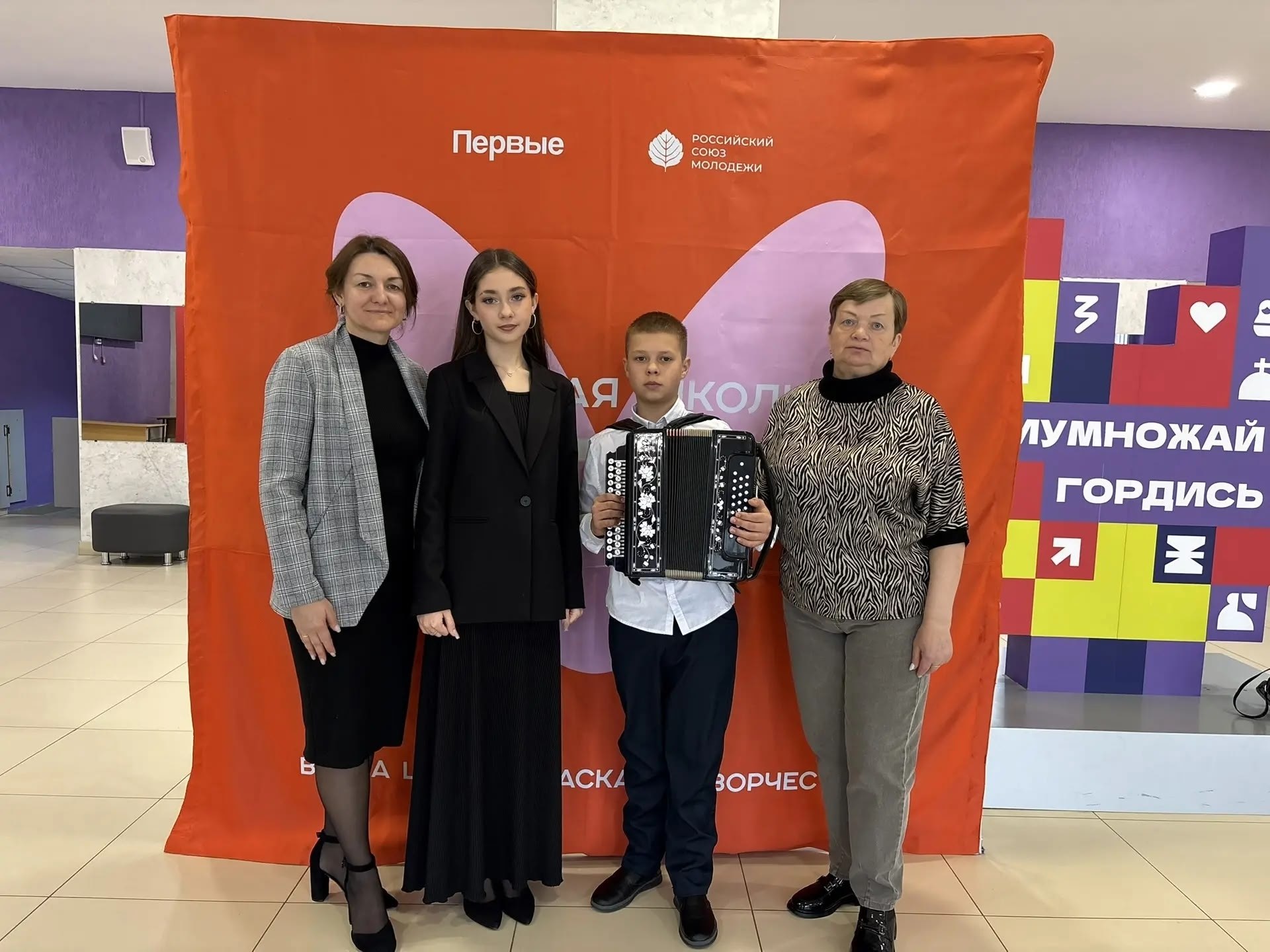 Вот артисты из Поныровского района: Дмитрий Румянцев, Софья Праведникова, Дарья Румянцева, Илья Черкасов, Амина Давлатназарова и хореографический коллектив «Юность».