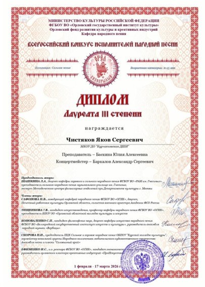 Чистяков Яков - Лауреат ||| степени.