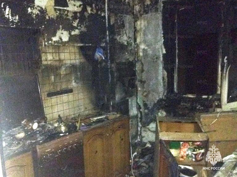Пожар локализован в 1:58, ликвидирован в 02:01. В трехкомнатной квартире площадью 60 квадратных метров огнем уничтожена кухня, повреждена мебель, закопчены стены и потолок по всей площади.