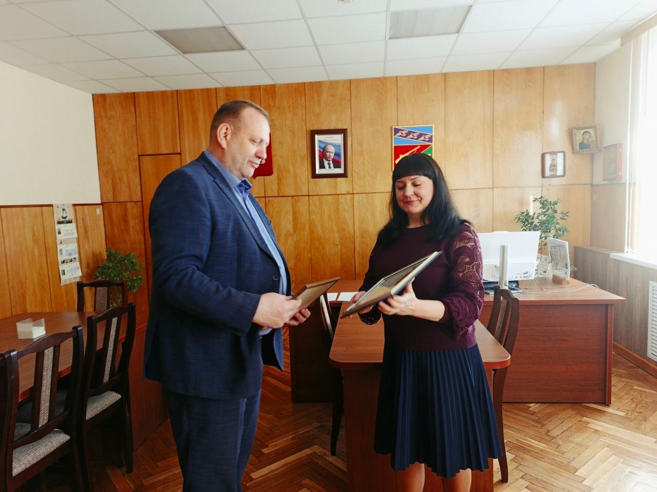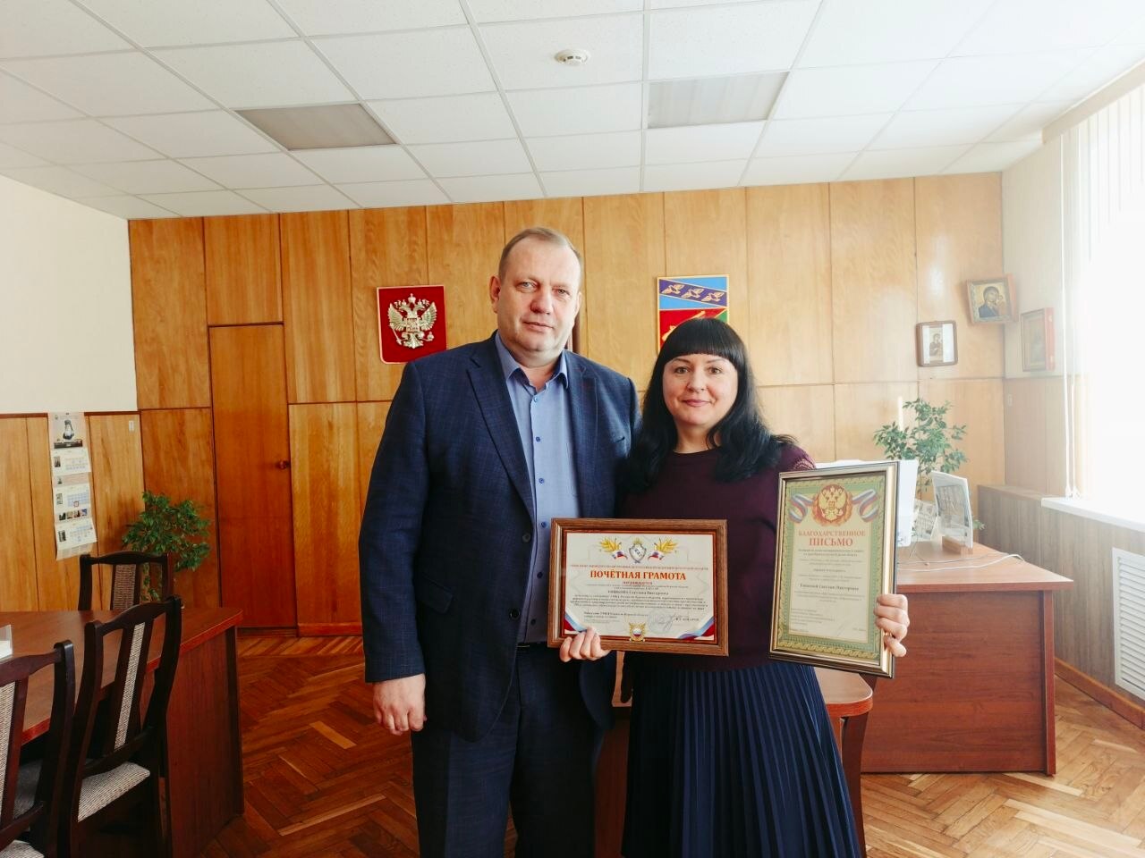 Глава Фатежского района Сергей Цуканов вручил главному специалисту-эксперту КНД и ЗП Администрации Фатежского района Тишковой Светлане Викторовне почетные награды: Благодарственное письмо Комиссии по делам несовершеннолетних и защите их прав Правительства Курской области за добросовестный труд в сфере профилактики безнадзорности и правонарушений несовершеннолетних, профессионализм и компетентность, Почетную грамоту Управления Министерства внутренних дел РФ по Курской области за помощь и содействие УМВД России по Курской области, выразившиеся в проведении активной работы в подростковой среде, противодействии подростковой преступности, профилактике правонарушений среди несовершеннолетних, а также в связи с празднованием 108-й годовщины образования комиссий по делам несовершеннолетних и защите их прав.