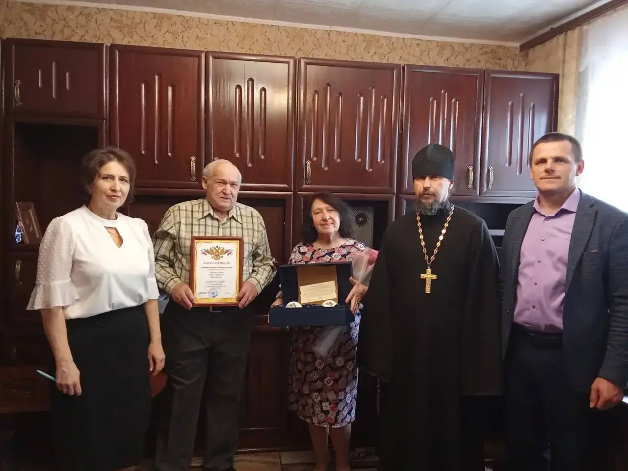 И.о. главы района Алексей Берлизев передал виновникам торжества поздравления и подарки от губернатора Курской области Александра Хинштейна, начальник отдела ЗАГС Наталья Смородина поблагодарила пары за сохранение традиционных ценностей, а священник Александр Добромиров — благословил семьи иконой Божьей Матери.