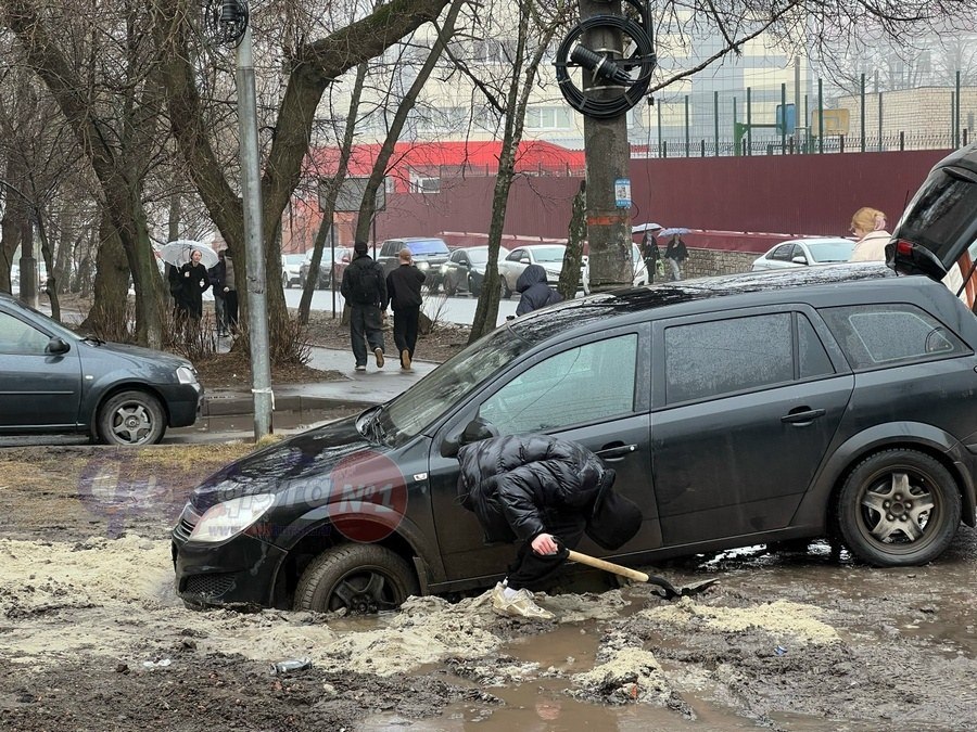 Зимой на этом участке ремонтировали теплосети. Разрытие засыпали землей и песком. Грунт просел, и автомобиль, припаркованный на газоне, сегодня попал в ловушку. Передними колесами машина увязла в газоне.