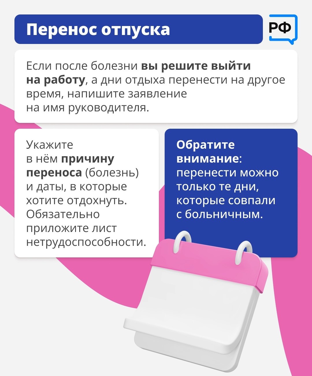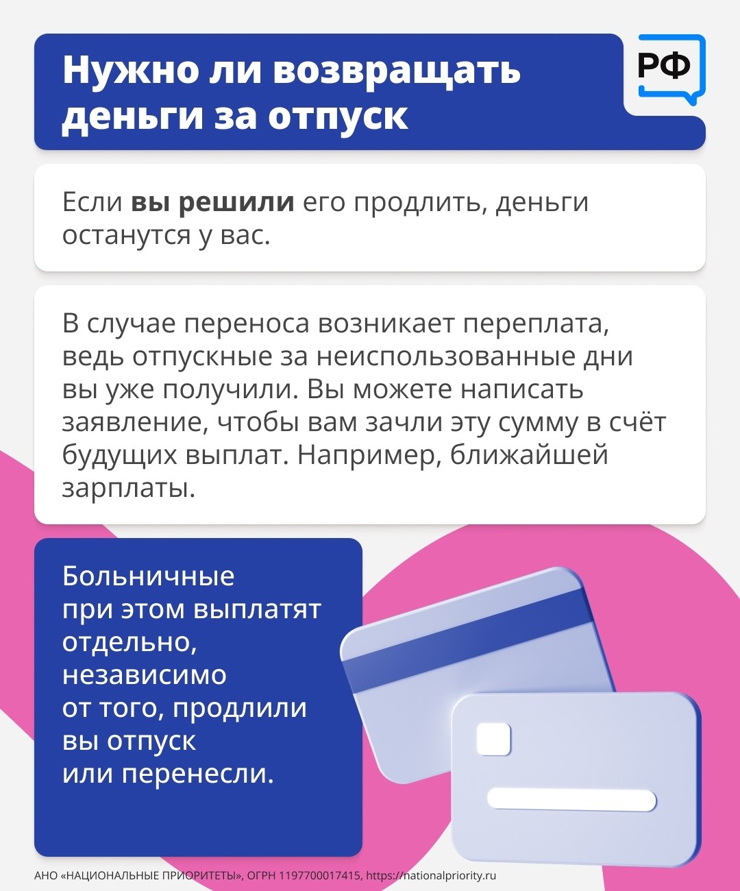 Хорошая новость: вы можете перенести отдых на другое время или продлить его. Как это сделать и нужно ли возвращать полученные отпускные — смотрите в карточках.