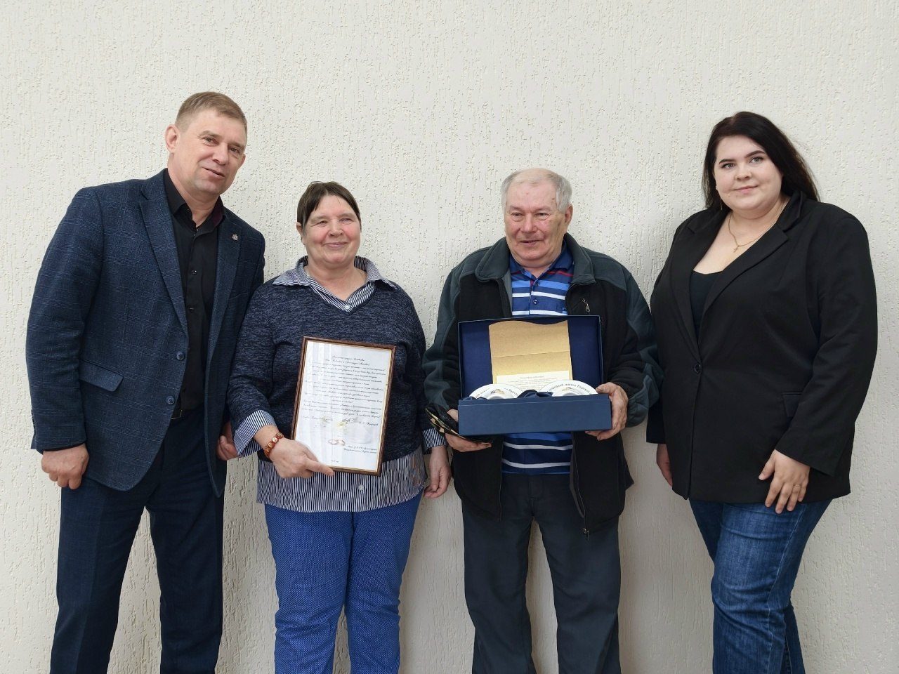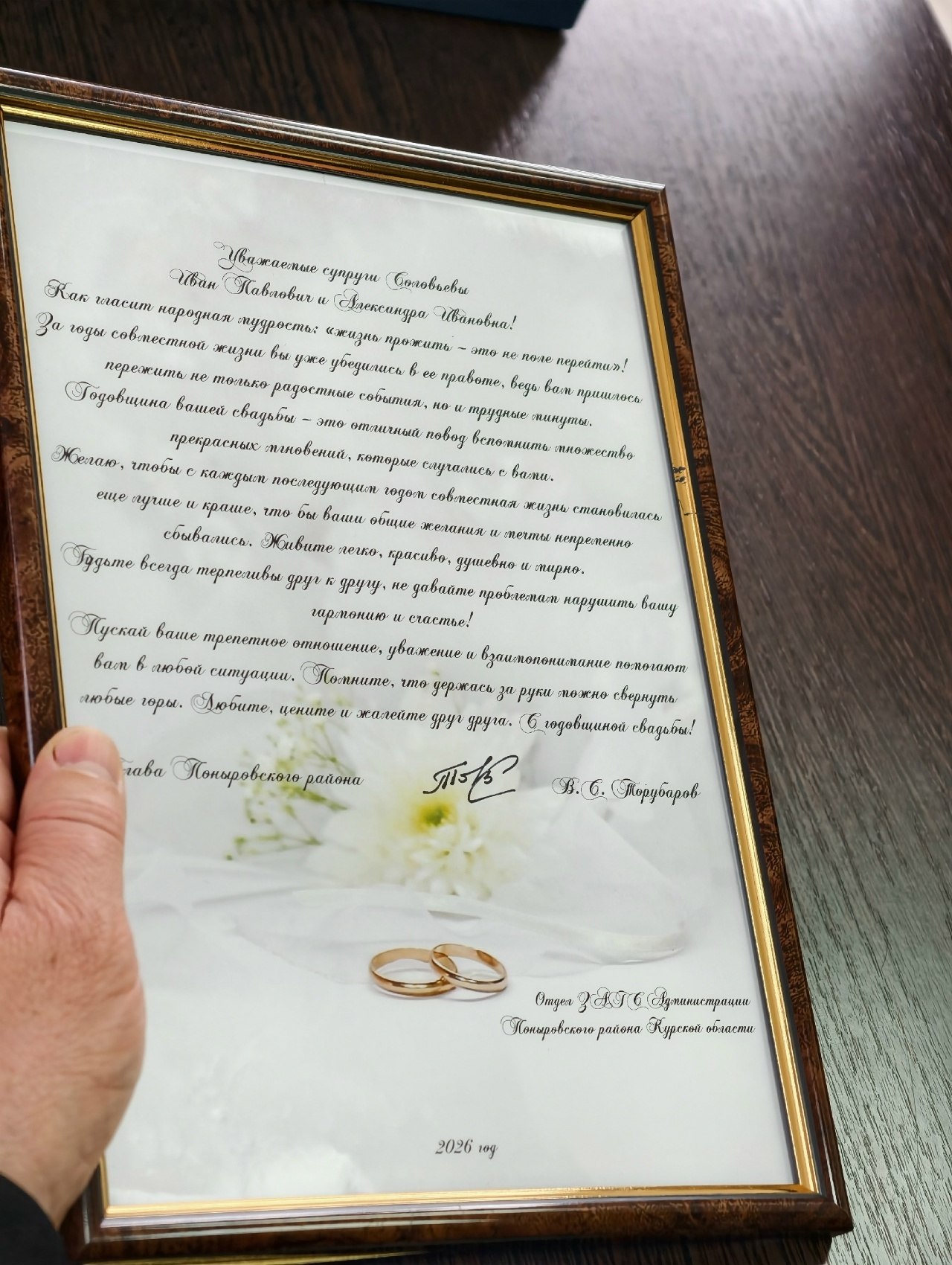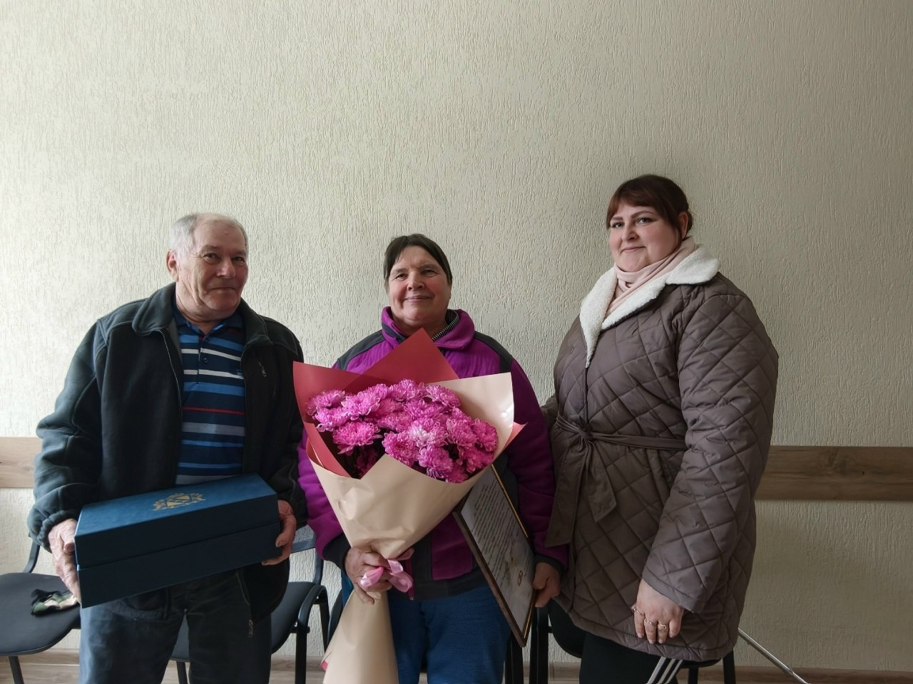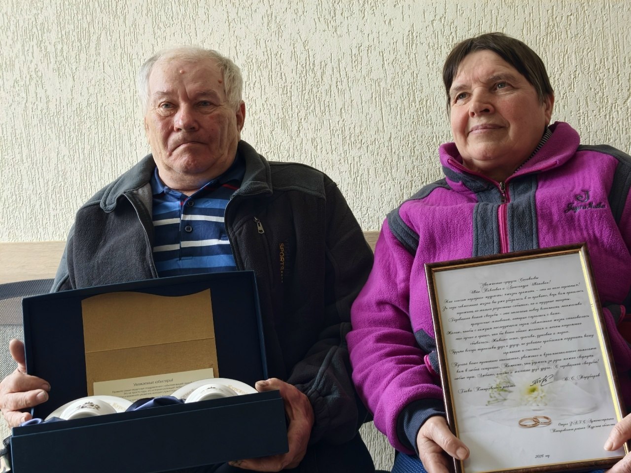 Юбиляров поздравил глава Поныровского района Владимир Торубаров. Он вручил им поздравительный адрес и пожелал крепкого здоровья и долгих лет жизни.