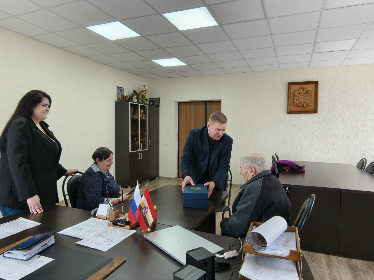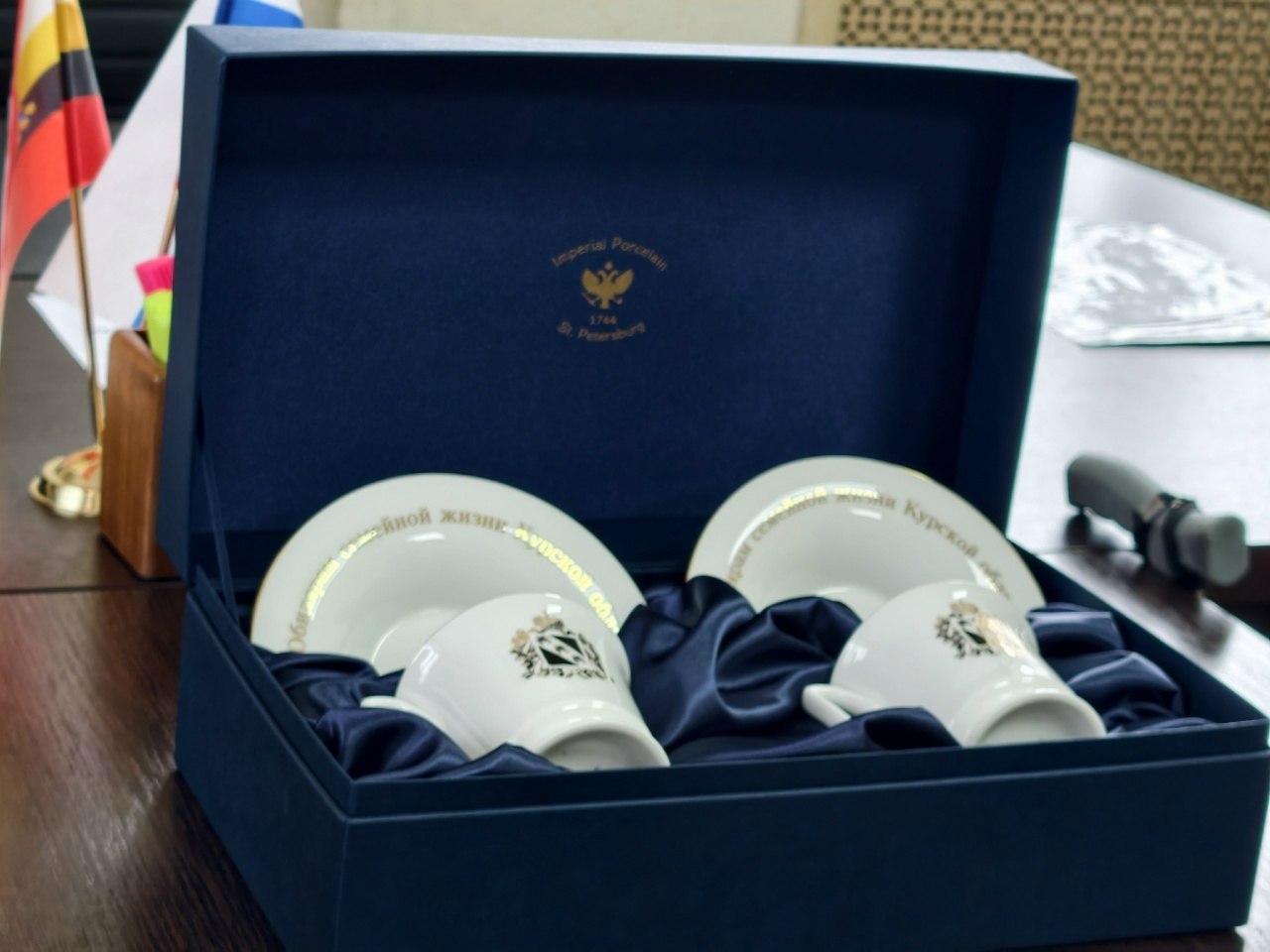 Исполняющая обязанности начальника отдела ЗАГС районной администрации Тамара Манекина вручила Соловьевым от имени губернатора Курской области памятный подарок – чайный набор Императорского фарфорового завода.