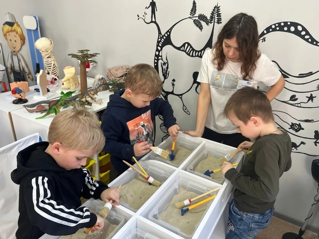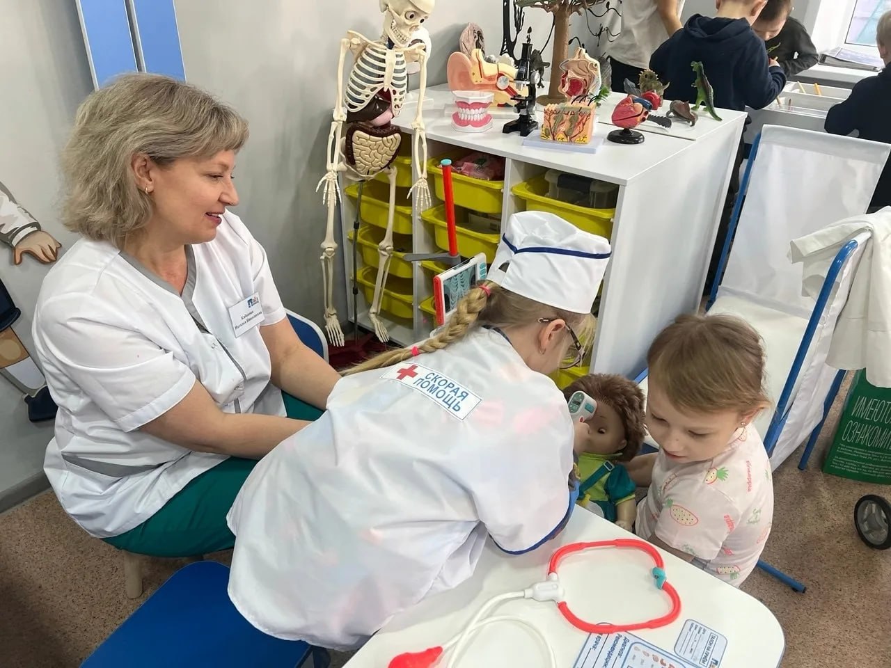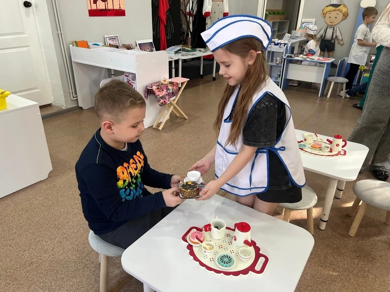 Дети создавали декорации, ухаживали за растениями, подбирали наряды, возводили стены, накрывали столы и угощали посетителей кафе, лечили пациентов и даже искали клад — всё как у взрослых, только в игре.