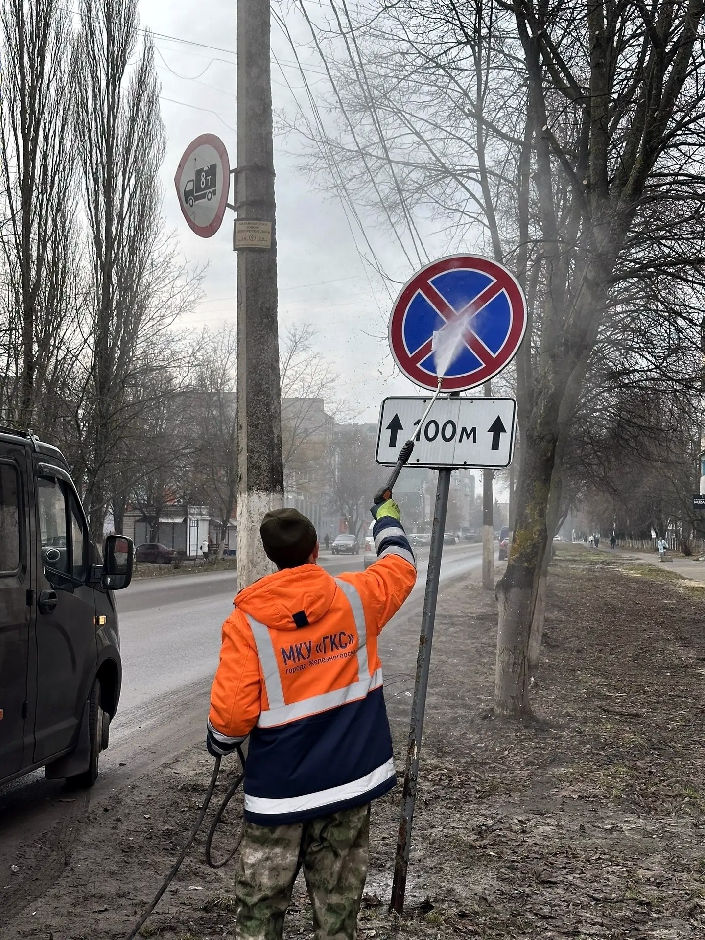 В Железногорске моют дорожные знаки.