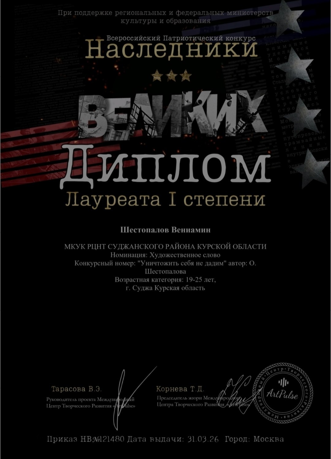 Поздравляем Вениамина Шестопалова с почетным званием Лауреата I степени Всероссийского конкурса «Наследники великих» в номинации «Художественное слово»!