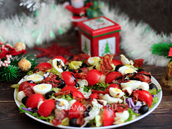 Новый год — это время не только подарков и веселых встреч, но и кулинарных шедевров. Яркий салат «Венок» станет настоящей звездой праздничного вечера. Его название вызывает ассоциации с рождественскими украшениями, а цветовая палитра из красных помидоров черри, зеленых листьев салата и золотистых яичных желтков наполняет атмосферу праздником. И, конечно же, шишечки бекона добавляют оригинальности и аппетитности, создавая гармоничное сочетание вкусов. Кроме того, готовится этот шедевр всего за несколько минут!