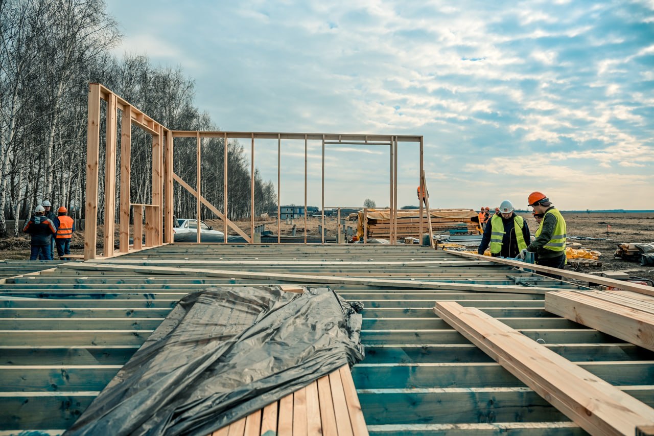 Подрядчик уже приступил к монтажу четырех демонстрационных домов разной площади. Для размещения конструкций обустроены свайные поля, подготовлены необходимые материалы. Дома строят по каркасной технологии, с полной внешней и внутренней отделкой с использованием экологичных и безопасных материалов.