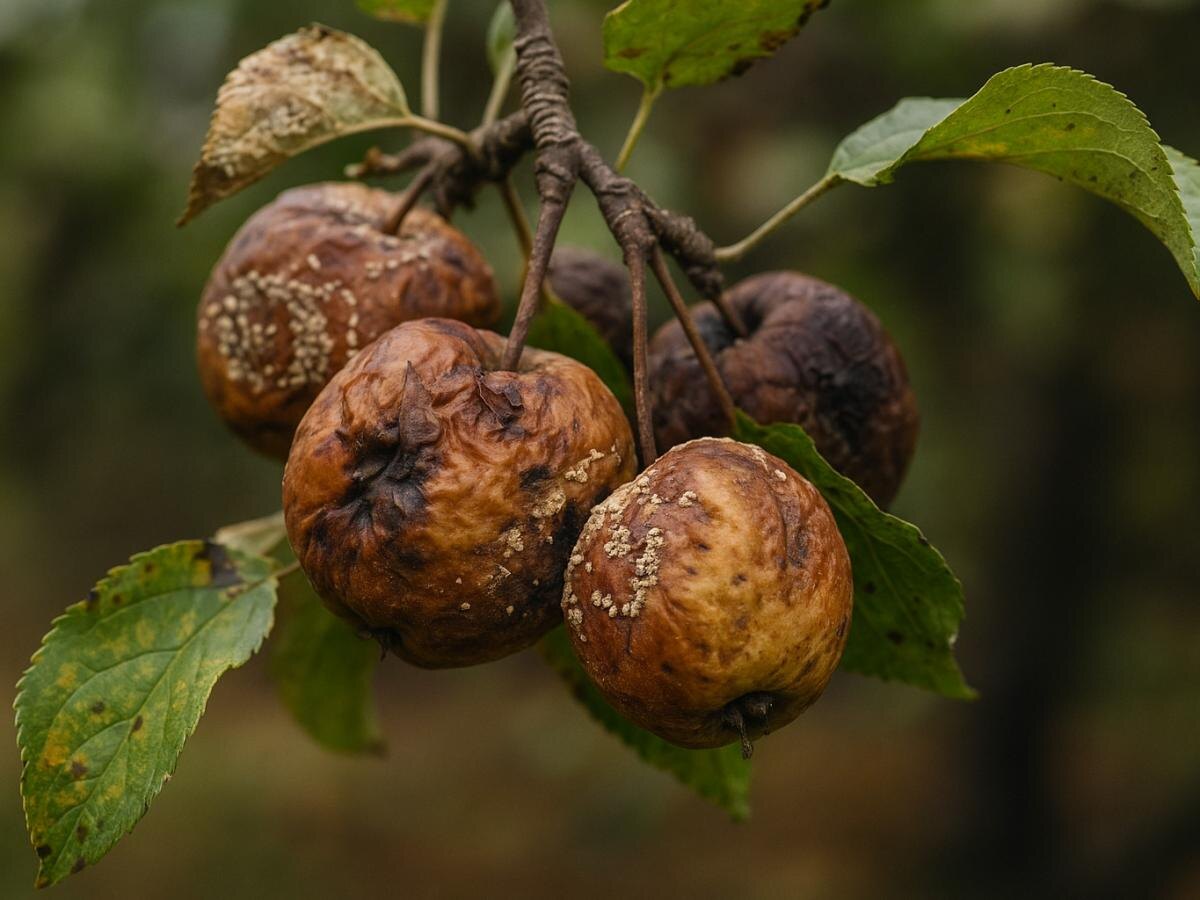Монилиоз — это грибковая инфекция, которая поражает как плоды, так и молодые побеги. Первые звоночки о проблеме проявляются в виде бурых пятен на яблоках и грушах, которые постепенно увеличиваются. На их поверхности можно заметить белые кольца спор. В конечном итоге мякоть плодов темнеет, они размягчаются и либо осыпаются, либо остаются висеть на дереве в виде «мумифицированного» остатка.