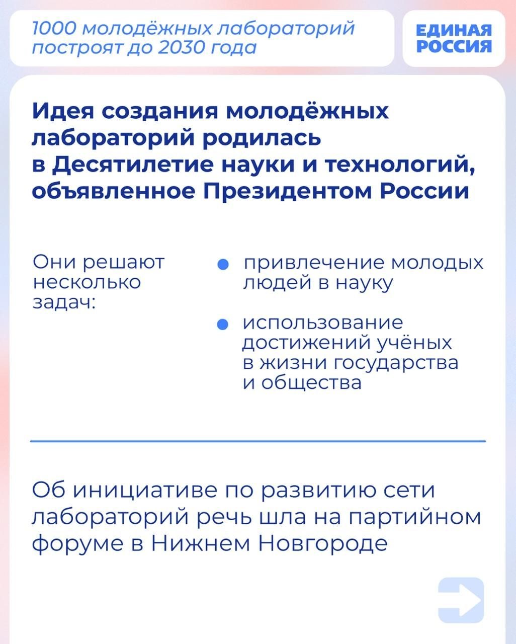 К 2030 году по народной программе партии в России построят 1000 молодёжных лабораторий. С их помощью молодые люди будут изучать химию, физику, биологию. Смогут совершать новые открытия и более осознанно подходить к выбору своей будущей профессии.