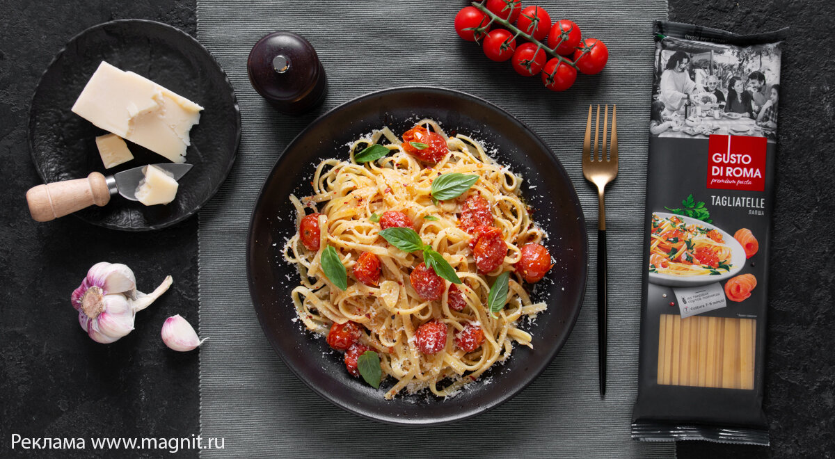 Тальятелле — это не просто паста, а настоящая находка на кухне. Лёгкое в приготовлении блюдо с непревзойденным вкусом придаётся благодаря запечённым помидорам черри и аромату чеснока. Это сочетание настолько выразительное, что даже не требует добавления тертого сыра, что делает его отличным вариантом для вегетарианцев.