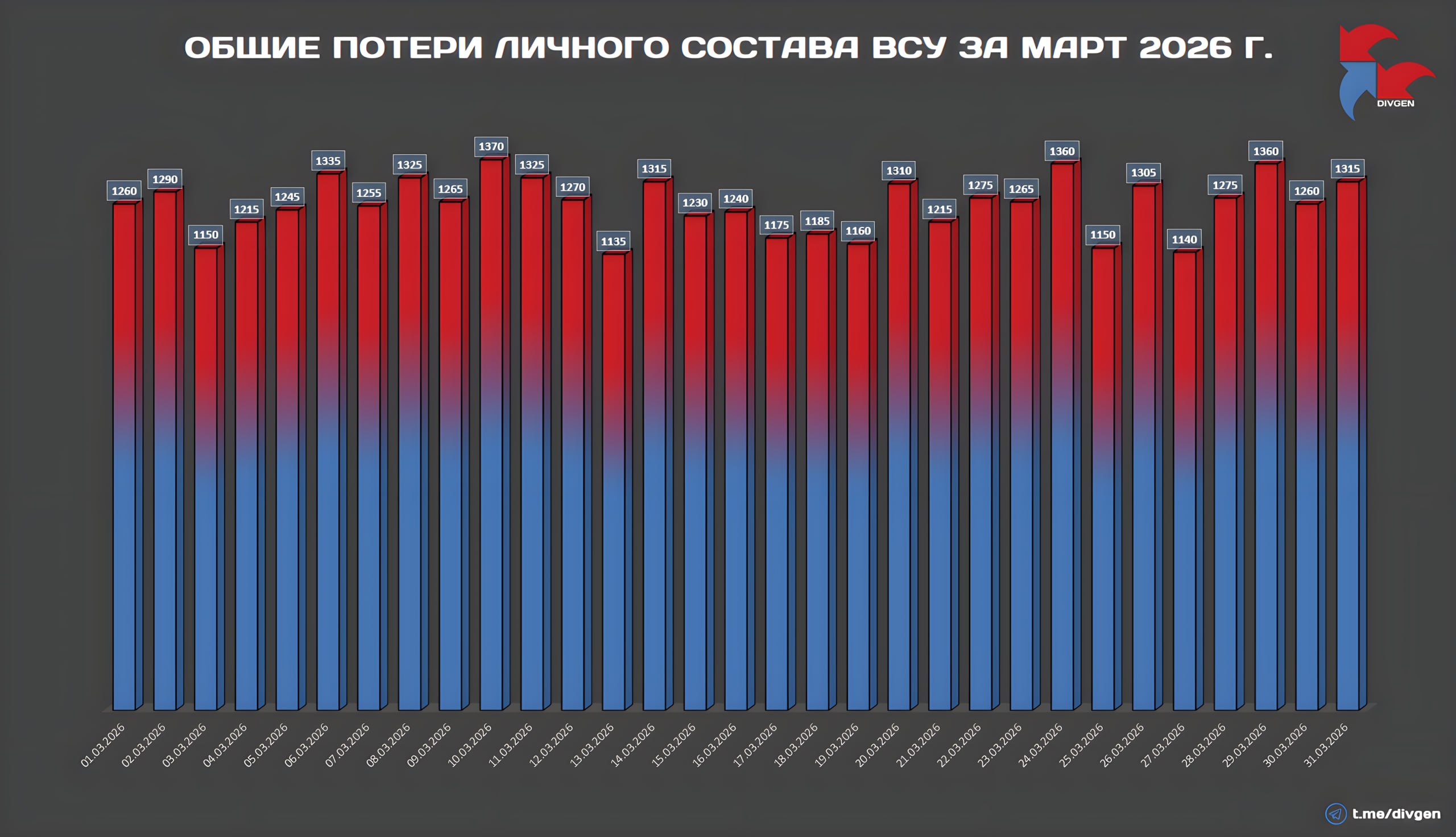 Общие потери личного состава Вооружённых сил Украины за март 2026 года по сводкам МО РФ составили 38975 человек.