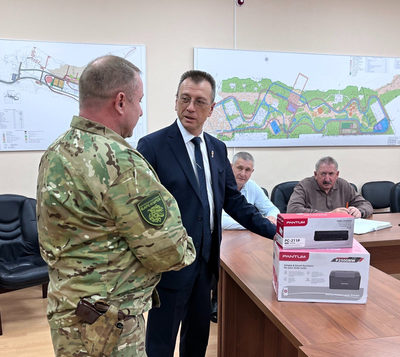 На очередном заседании Штаба по оказанию гуманитарной помощи в связи с проведением СВО и формированию самообороны города Курчатова передали представителям бригады «Барс–Курск», необходимый в работе, лазерный принтер для печати с комплектующими.