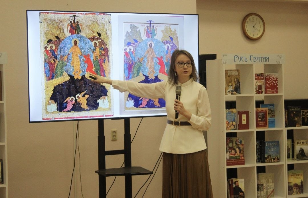 Присутствовавшие на встрече мальчики и девочки с интересом узнали, что в честь Воскресения Христова на протяжении столетий пишутся иконы, которым совсем скоро предстоит занять центральное место в храмах на сорок дней. Этот и многие другие факты сообщила юным курянам Анастасия Кохно – художница иконописной школы имени преподобного Андрея Рублева. Она пояснила разницу между образом и картиной, с помощью экрана истолковала в деталях значение пасхальных икон, рассказала о работе коллег-иконописцев, требующей не только долгой подготовки и мастерства, но и особого настроя духа.